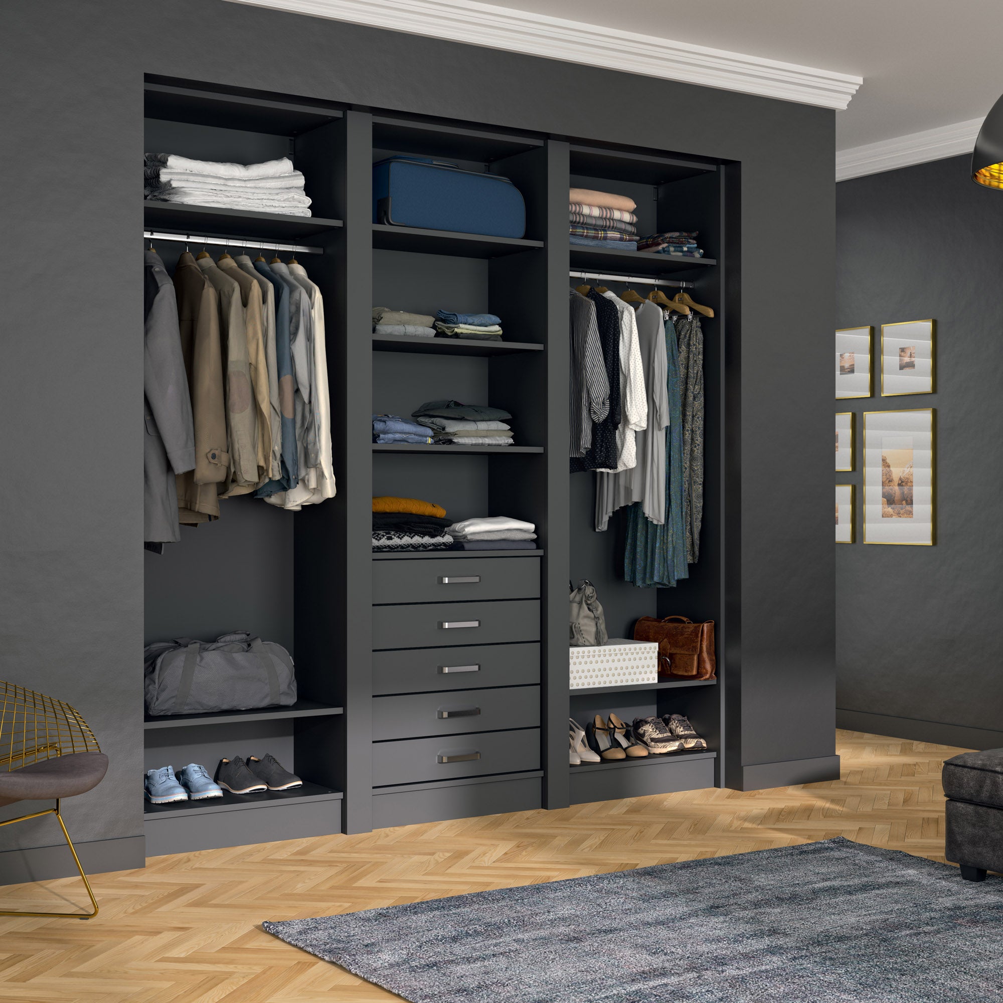 Ce dressing Graphite de 3 espaces est composé de deux tringles (2 penderies longues pour les robes et manteaux), de 8 étagères de rangement (idéales pour les vêtements pliés, comme les t-shirts et les pulls), et de cinq tiroirs simples (pour accueillir les accessoires et les ceintures).