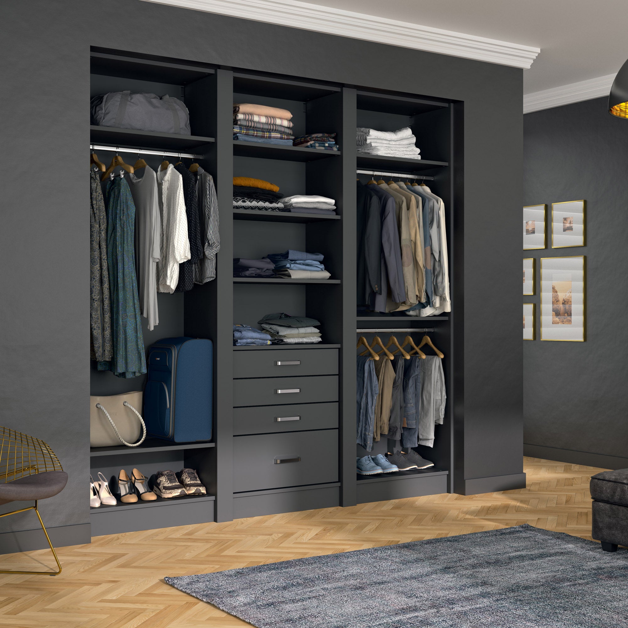 Ce dressing Graphite de 3 espaces est composé de trois tringles (1 penderie longue pour les robes et manteaux et 2 penderies courtes pour les vêtements de type chemises, vestes), de 8 étagères de rangement (idéales pour les vêtements pliés, comme les t-shirts et les pulls), et de trois tiroirs simples (pour accueillir les accessoires et les ceintures).