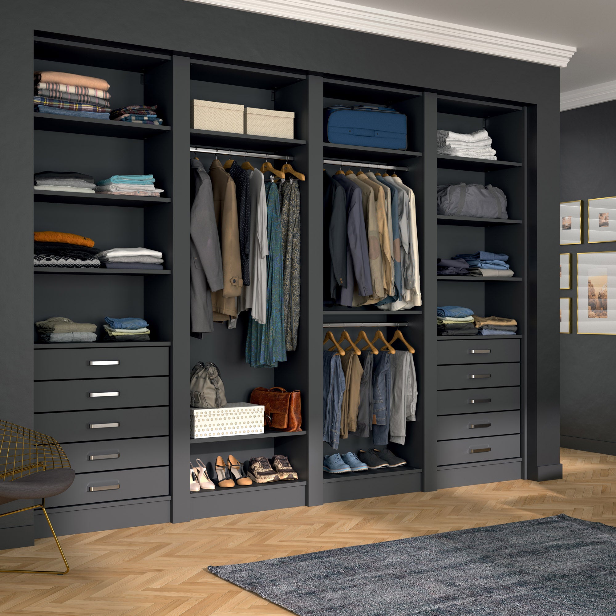 Ce dressing Graphite de 4 espaces est composé de trois tringles (1 penderie longue pour les robes et manteaux et 2 penderies courtes pour les vêtements de type chemises, vestes), de 12 étagères de rangement (idéales pour les vêtements pliés, comme les t-shirts et les pulls), et de dix tiroirs simples (pour accueillir les accessoires et les ceintures).