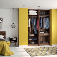 Ce dressing Noyer des Andes de 2 espaces est composé de deux tringles (1 penderie longue pour les robes et manteaux et 1 penderie courte pour les vêtements de type chemises, vestes), de 5 étagères de rangement (idéales pour les vêtements pliés, comme les t-shirts et les pulls), et d'un tiroir simple (pour accueillir les accessoires et les ceintures).