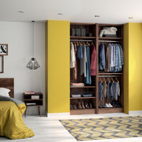Ce dressing Noyer des Andes de 2 espaces est composé de trois tringles (1 penderie longue pour les robes et manteaux et 2 penderies courtes pour les vêtements de type chemises, vestes) et de 5 étagères de rangement (idéales pour les vêtements pliés, comme les t-shirts et les pulls).