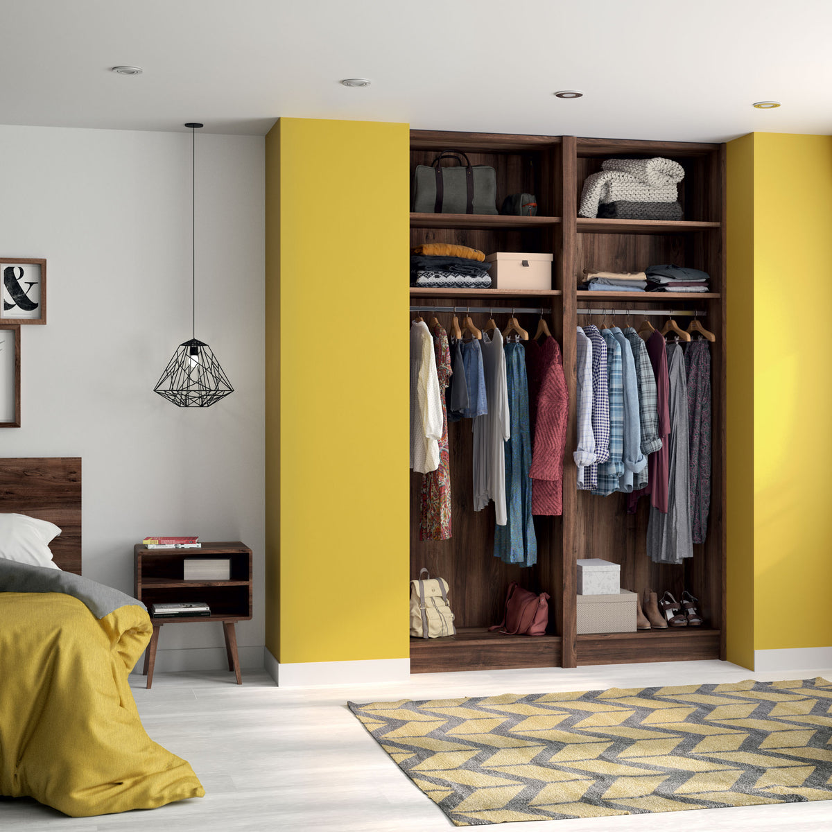 Ce dressing Noyer des Andes de 2 espaces est composé de deux tringles (2 penderies longues pour les robes et manteaux) et de 4 étagères de rangement (idéales pour les vêtements pliés, comme les t-shirts et les pulls).