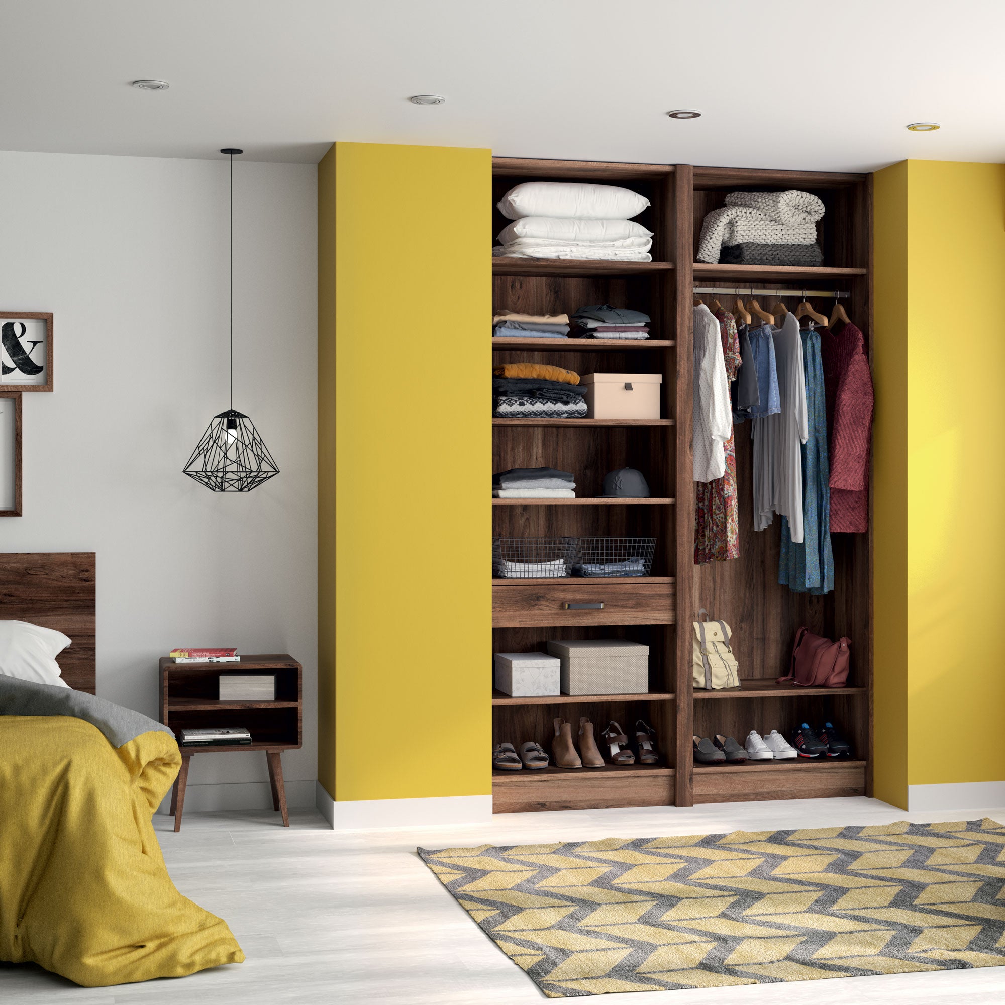 Ce dressing Noyer des Andes de 2 espaces est composé d'une tringle (1 penderie longue pour les robes et manteaux), de 8 étagères de rangement (idéales pour les vêtements pliés, comme les t-shirts et les pulls), et d'un tiroir simple (pour accueillir les accessoires et les ceintures).