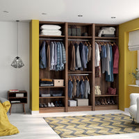 Ce dressing Noyer des Andes de 3 espaces est composé de quatre tringles (2 penderies longues pour les robes et manteaux et 2 penderies courtes pour les vêtements de type chemises, vestes) et de 7 étagères de rangement (idéales pour les vêtements pliés, comme les t-shirts et les pulls).