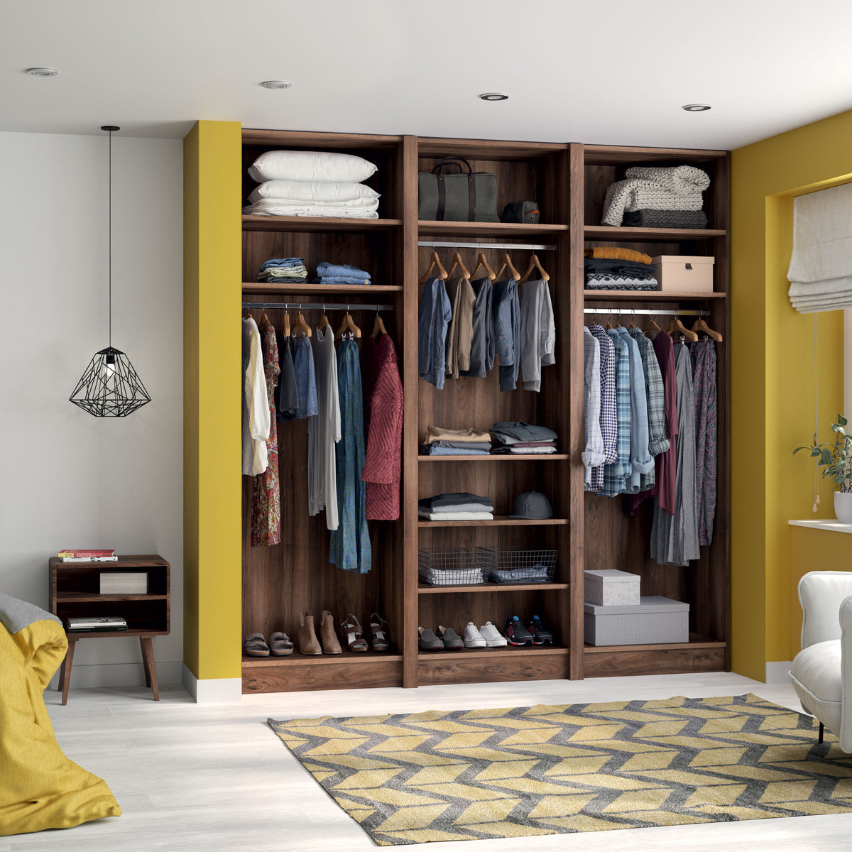 Ce dressing Noyer des Andes de 3 espaces est composé de trois tringles (2 penderies longues pour les robes et manteaux) et de 8 étagères de rangement (idéales pour les vêtements pliés, comme les t-shirts et les pulls).