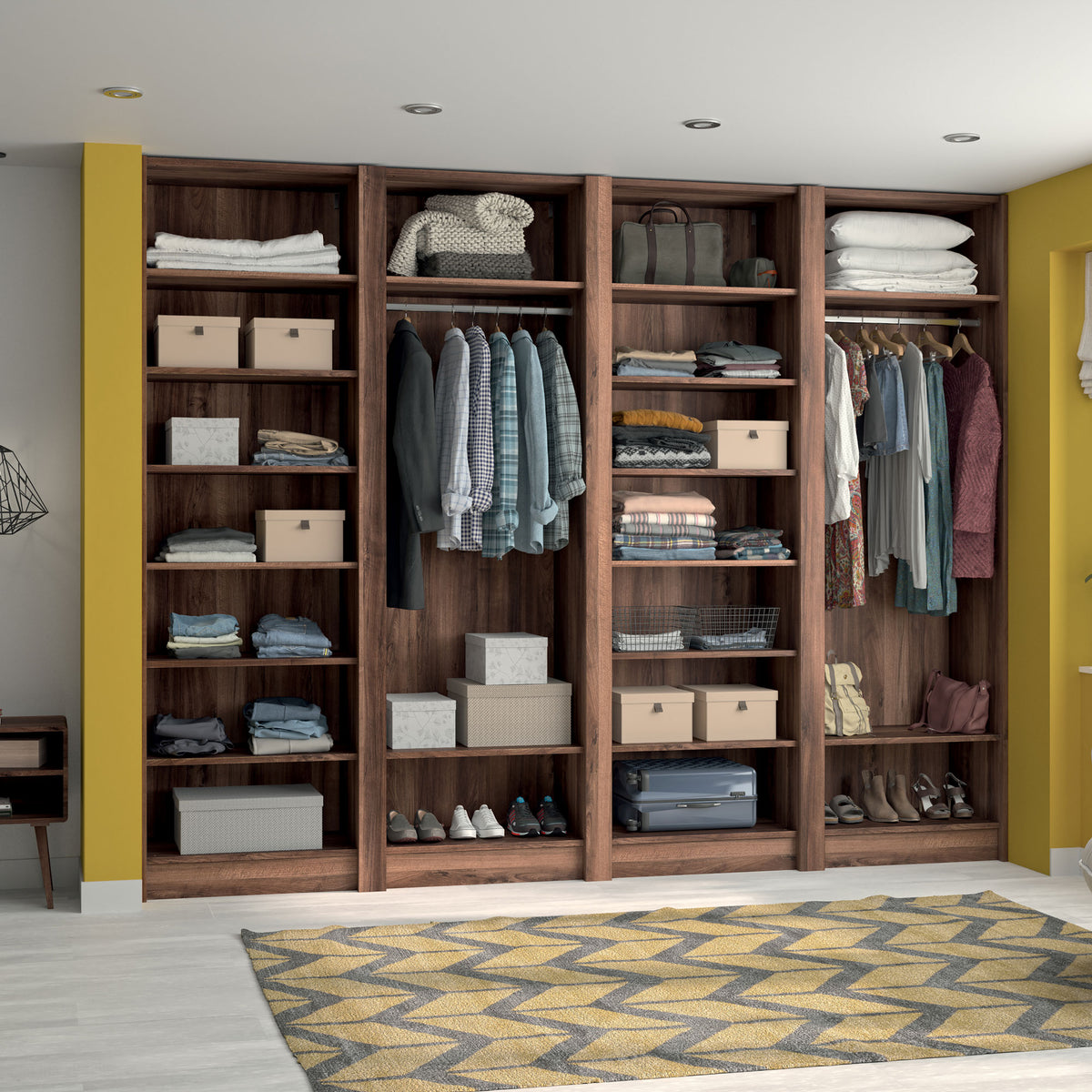 Ce dressing Noyer des Andes de 4 espaces est composé de deux tringles (2 penderies longues pour les robes et manteaux) et de 16 étagères de rangement (idéales pour les vêtements pliés, comme les t-shirts et les pulls).