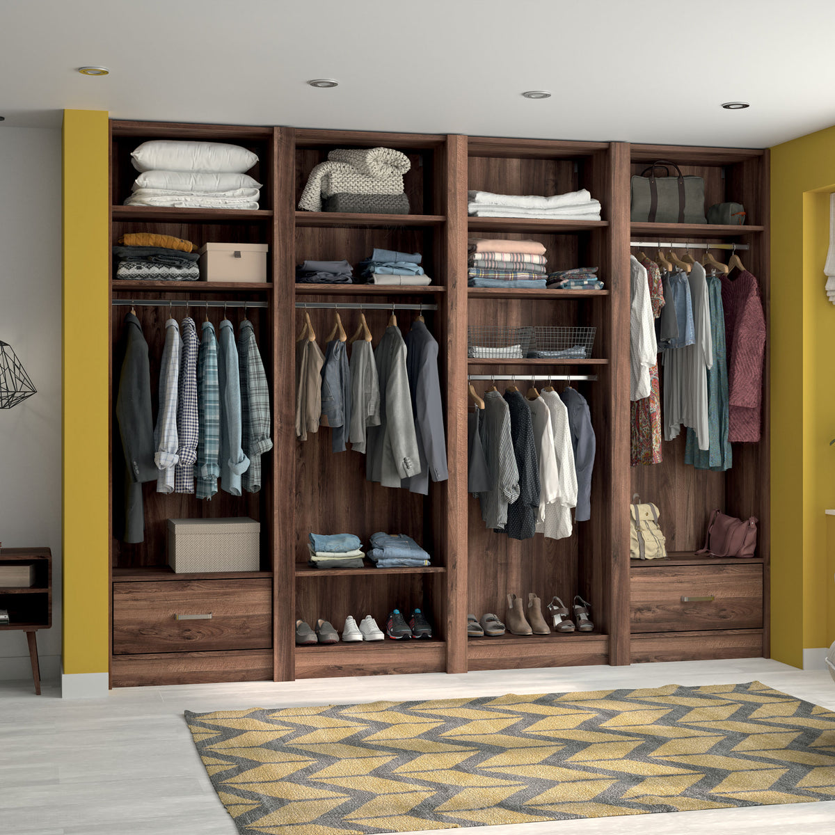 Ce dressing Noyer des Andes de 4 espaces est composé de quatre tringles (4 penderies courtes pour les vêtements de type chemises, vestes), de 11 étagères de rangement (idéales pour les vêtements pliés, comme les t-shirts et les pulls), et de deux tiroirs doubles (pour recevoir des objets volumineux comme les sous vêtements).