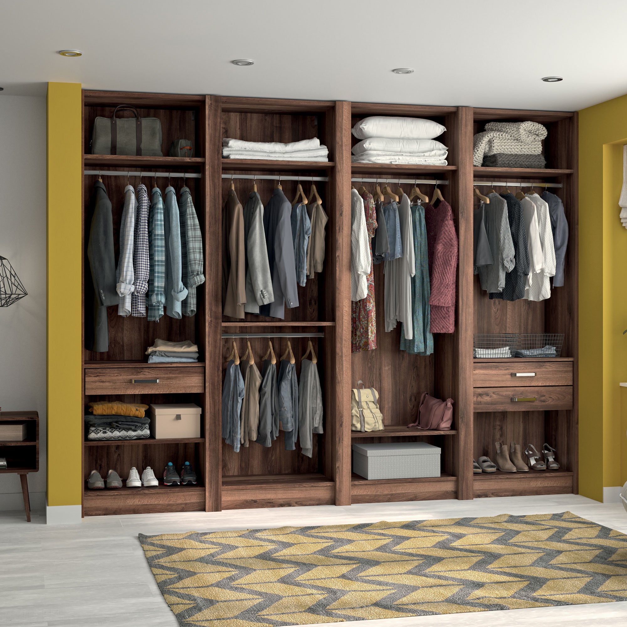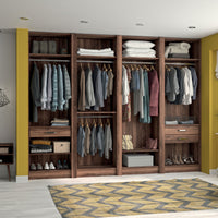 Ce dressing Noyer des Andes de 4 espaces est composé de cinq tringles (2 penderies longues pour les robes et manteaux et 4 penderies courtes pour les vêtements de type chemises, vestes), de 9 étagères de rangement (idéales pour les vêtements pliés, comme les t-shirts et les pulls), et de trois tiroirs simples (pour accueillir les accessoires et les ceintures).