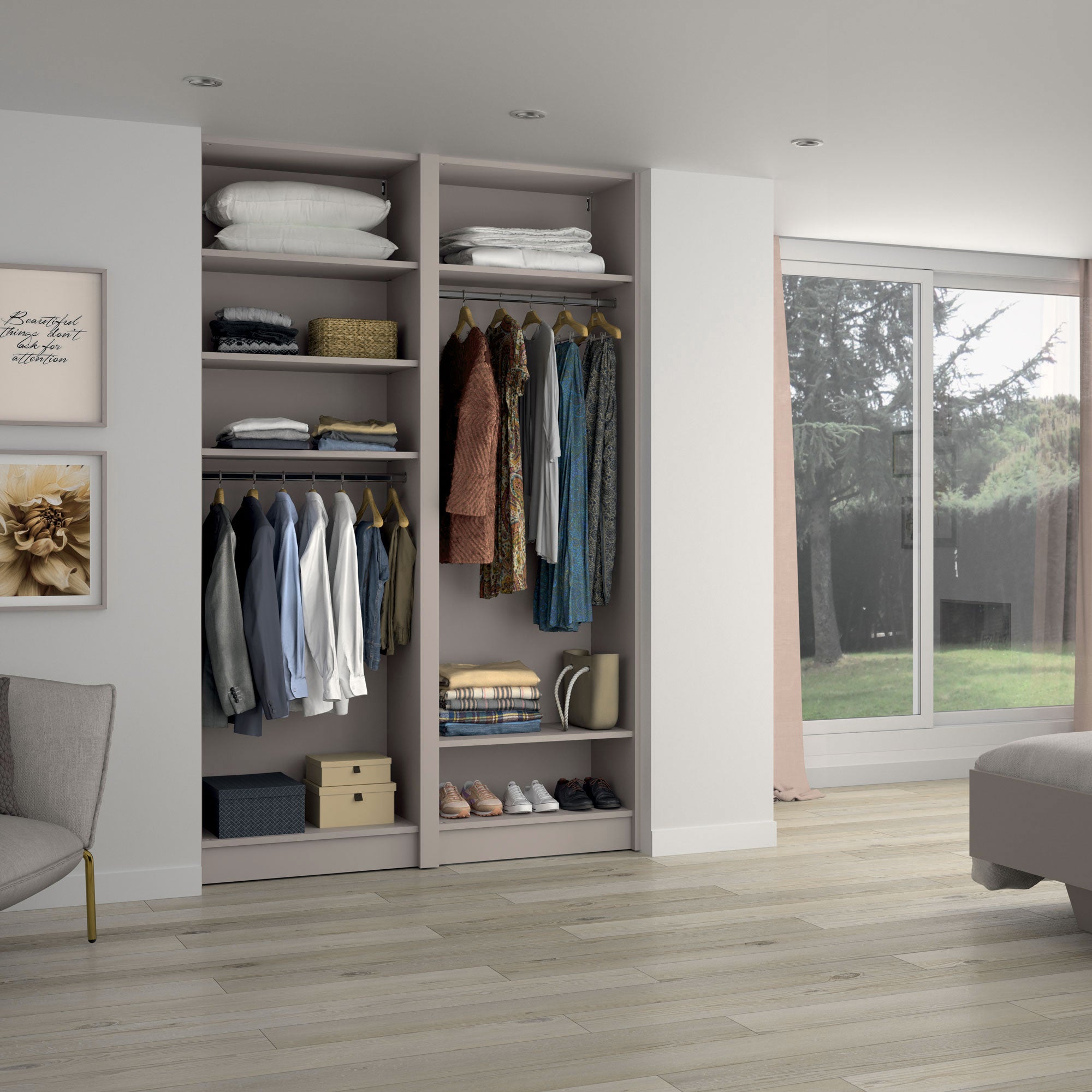 Les points forts : Fabriqué à vos dimensions. Epaisseur de la structure 22 mm, fond de 8 mm monté en rainure pour une rigidité parfaite. Des pieds de réglages permettent le bon ajustement de votre dressing. Konsilio est parfaitement adapté à une installation avec ou sans portes de placard Kazed.