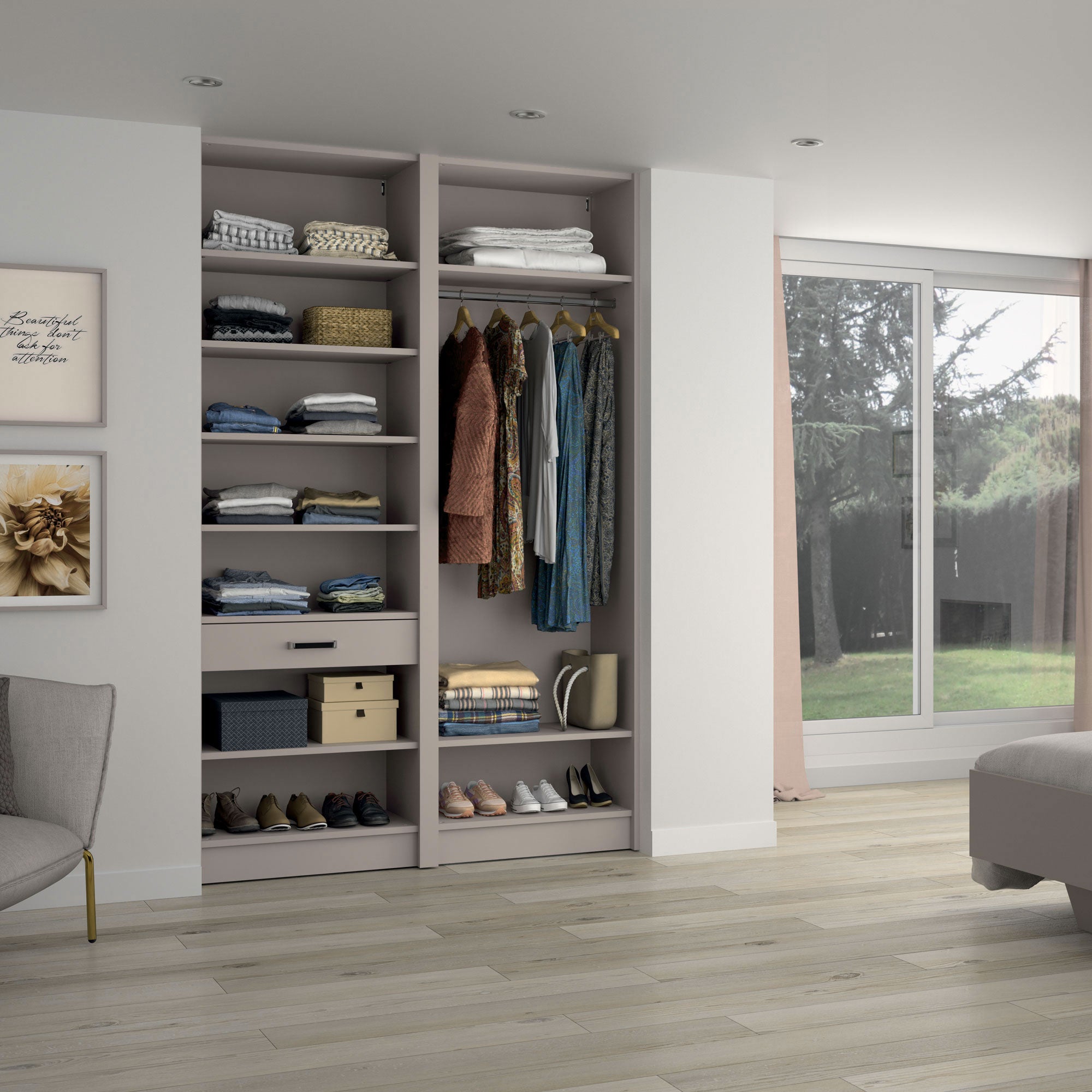Les points forts : Fabriqué à vos dimensions. Epaisseur de la structure 22 mm, fond de 8 mm monté en rainure pour une rigidité parfaite. Des pieds de réglages permettent le bon ajustement de votre dressing. Konsilio est parfaitement adapté à une installation avec ou sans portes de placard Kazed.