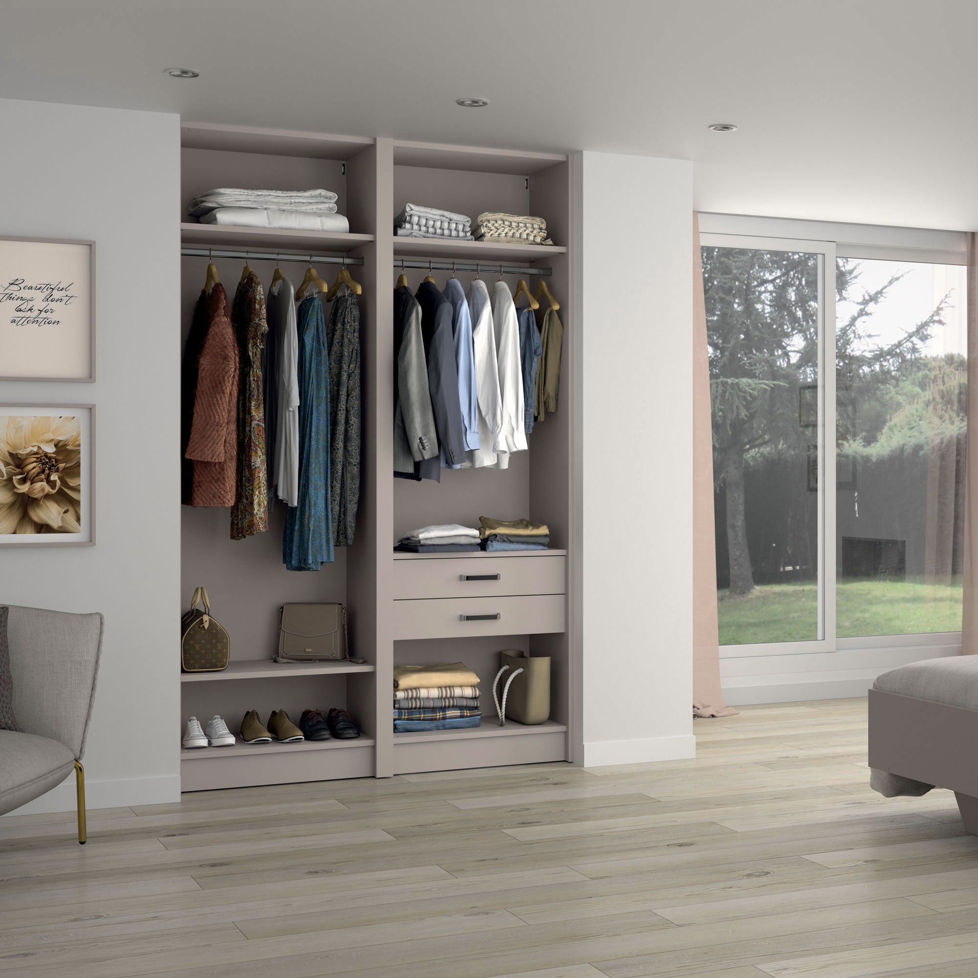 Les points forts : Fabriqué à vos dimensions. Epaisseur de la structure 22 mm, fond de 8 mm monté en rainure pour une rigidité parfaite. Des pieds de réglages permettent le bon ajustement de votre dressing. Konsilio est parfaitement adapté à une installation avec ou sans portes de placard Kazed.
