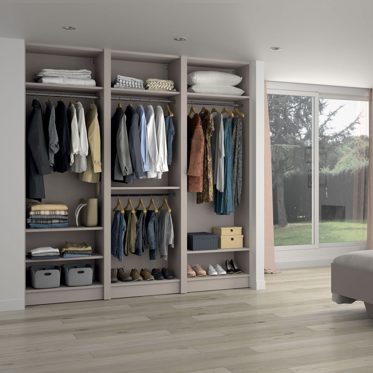 Les points forts : Fabriqué à vos dimensions. Epaisseur de la structure 22 mm, fond de 8 mm monté en rainure pour une rigidité parfaite. Des pieds de réglages permettent le bon ajustement de votre dressing. Konsilio est parfaitement adapté à une installation avec ou sans portes de placard Kazed.