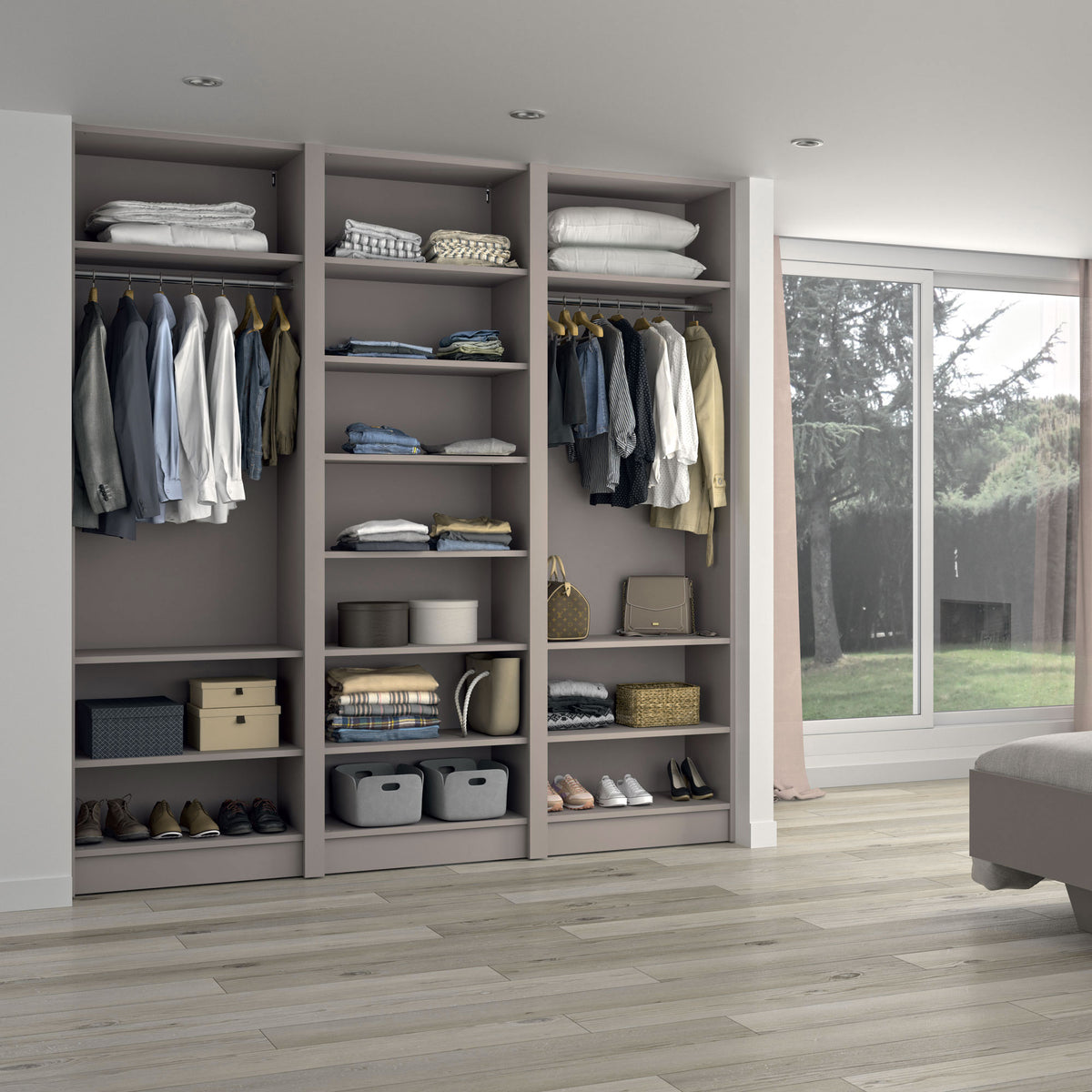 Les points forts : Fabriqué à vos dimensions. Epaisseur de la structure 22 mm, fond de 8 mm monté en rainure pour une rigidité parfaite. Des pieds de réglages permettent le bon ajustement de votre dressing. Konsilio est parfaitement adapté à une installation avec ou sans portes de placard Kazed.