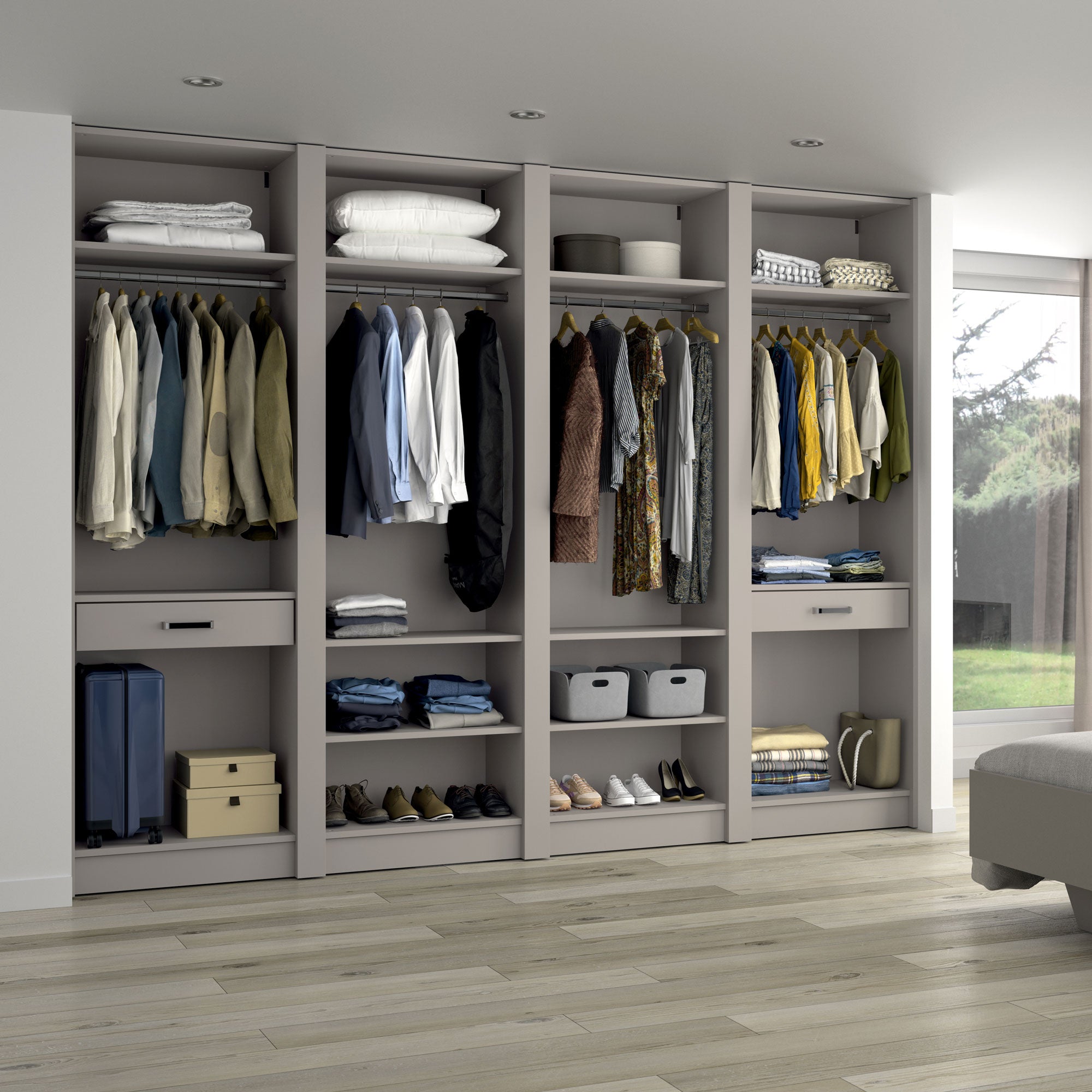 Les points forts : Fabriqué à vos dimensions. Epaisseur de la structure 22 mm, fond de 8 mm monté en rainure pour une rigidité parfaite. Des pieds de réglages permettent le bon ajustement de votre dressing. Konsilio est parfaitement adapté à une installation avec ou sans portes de placard Kazed.