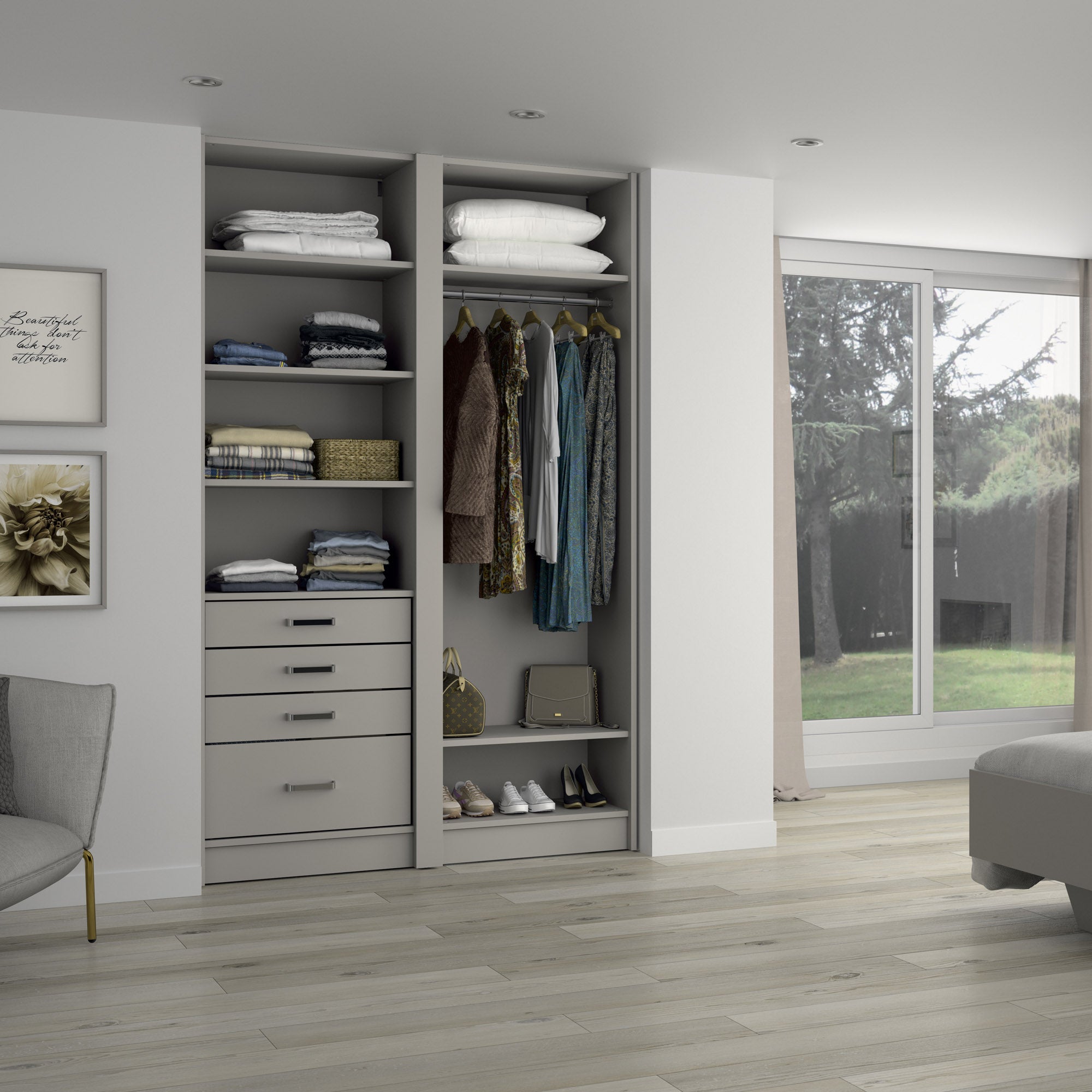 Les points forts : Fabriqué à vos dimensions. Epaisseur de la structure 22 mm, fond de 8 mm monté en rainure pour une rigidité parfaite. Des pieds de réglages permettent le bon ajustement de votre dressing. Konsilio est parfaitement adapté à une installation avec ou sans portes de placard Kazed.