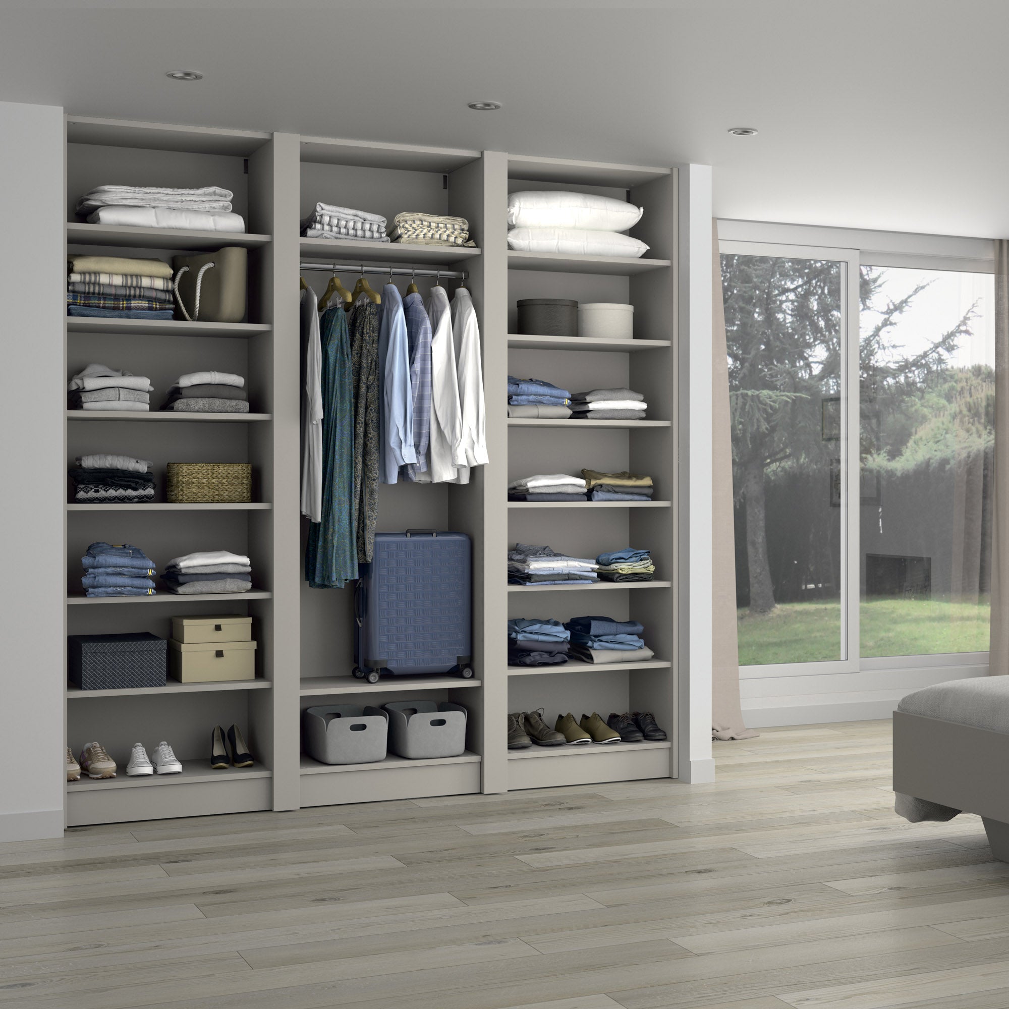 Les points forts : Fabriqué à vos dimensions. Epaisseur de la structure 22 mm, fond de 8 mm monté en rainure pour une rigidité parfaite. Des pieds de réglages permettent le bon ajustement de votre dressing. Konsilio est parfaitement adapté à une installation avec ou sans portes de placard Kazed.