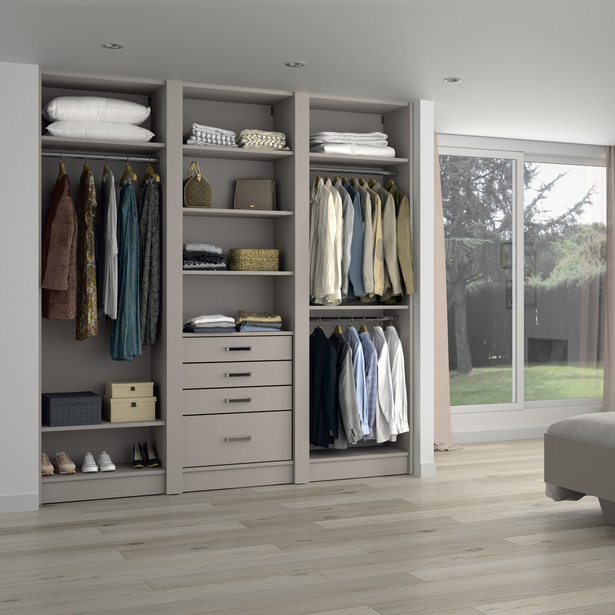 Les points forts : Fabriqué à vos dimensions. Epaisseur de la structure 22 mm, fond de 8 mm monté en rainure pour une rigidité parfaite. Des pieds de réglages permettent le bon ajustement de votre dressing. Konsilio est parfaitement adapté à une installation avec ou sans portes de placard Kazed.