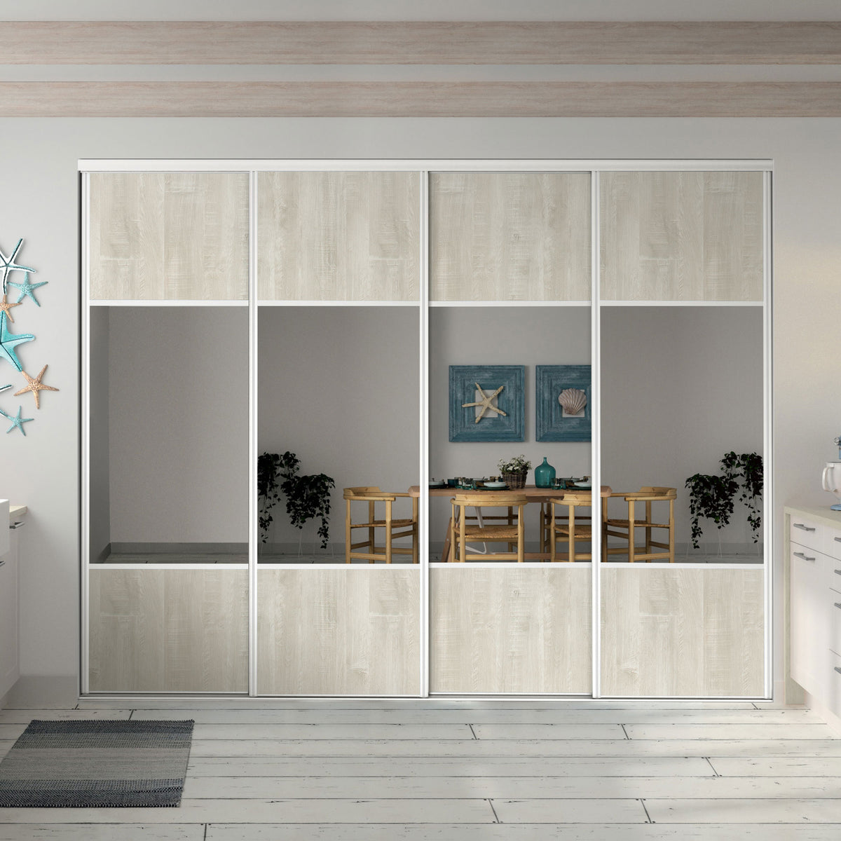Les tons clairs du Bois flotté crème et la finition Blanc mat de ces portes de placard coulissantes apportent de la clarté à votre pièce. Un grand miroir central Argent vient compléter cette composition au style Bord de mer épuré et lumineux.