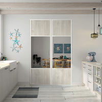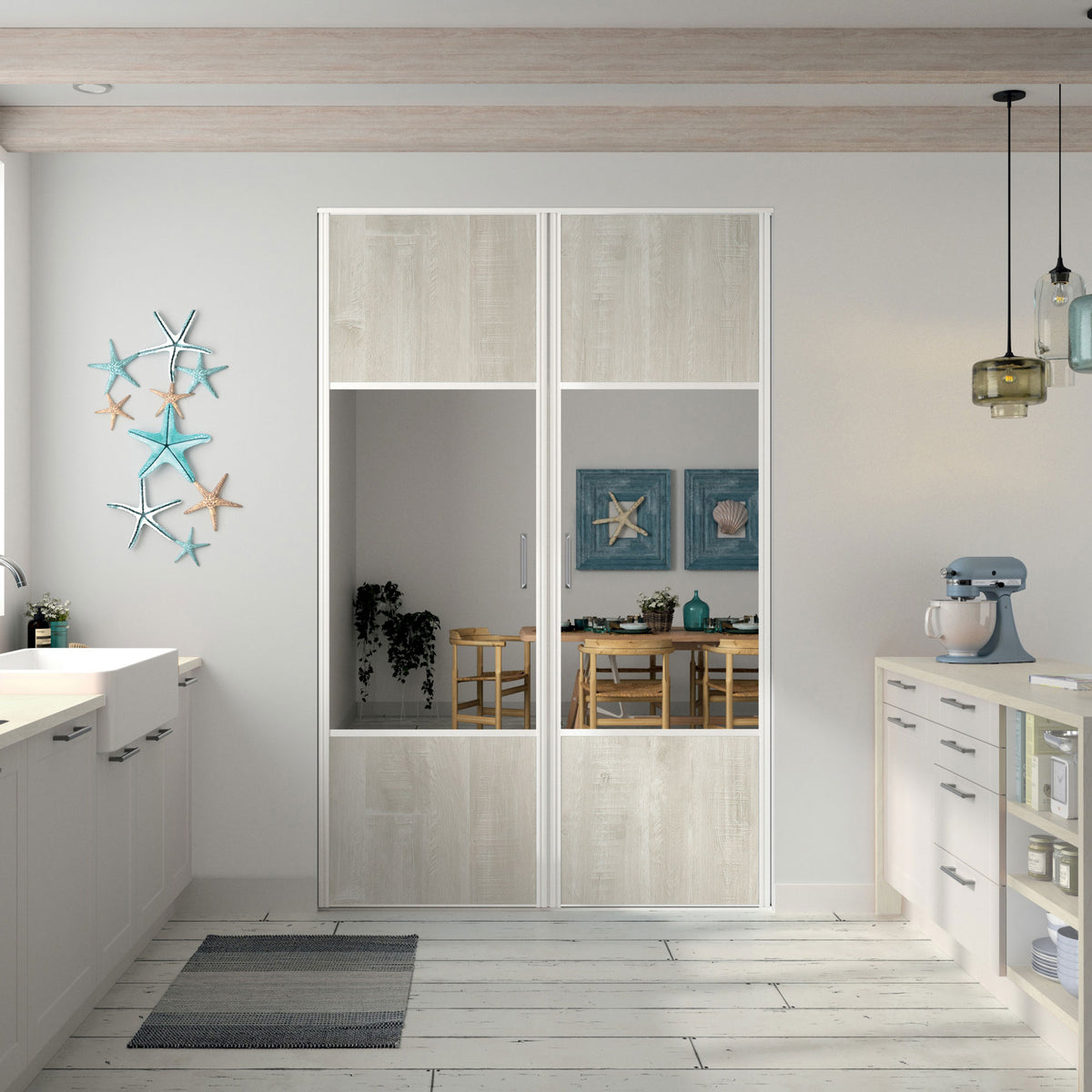 Les tons clairs du Bois flotté crème et la finition Blanc mat de ces portes de placard coulissantes apportent de la clarté à votre pièce. Un grand miroir central Argent vient compléter cette composition au style Bord de mer épuré et lumineux.