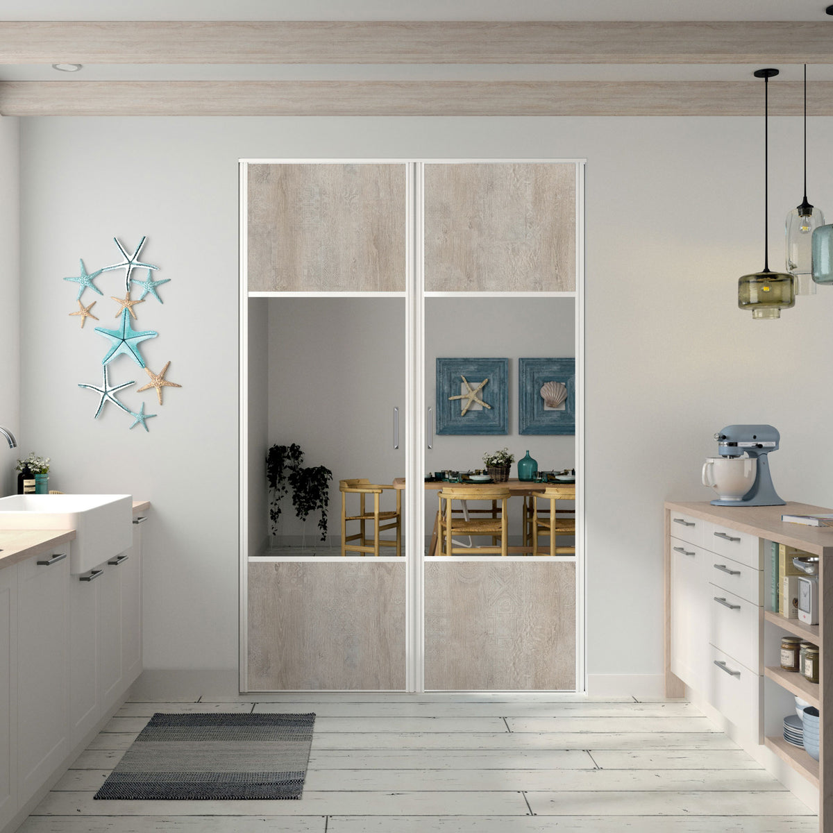 Naturel et chaleureux, l’effet Bois bohème de ces portes pivotantes Kazed donne à cette façade de placard un style marin moderne et doux. Il est accompagné d’un lumineux miroir Argent et de finitions en aluminium Blanc mat.