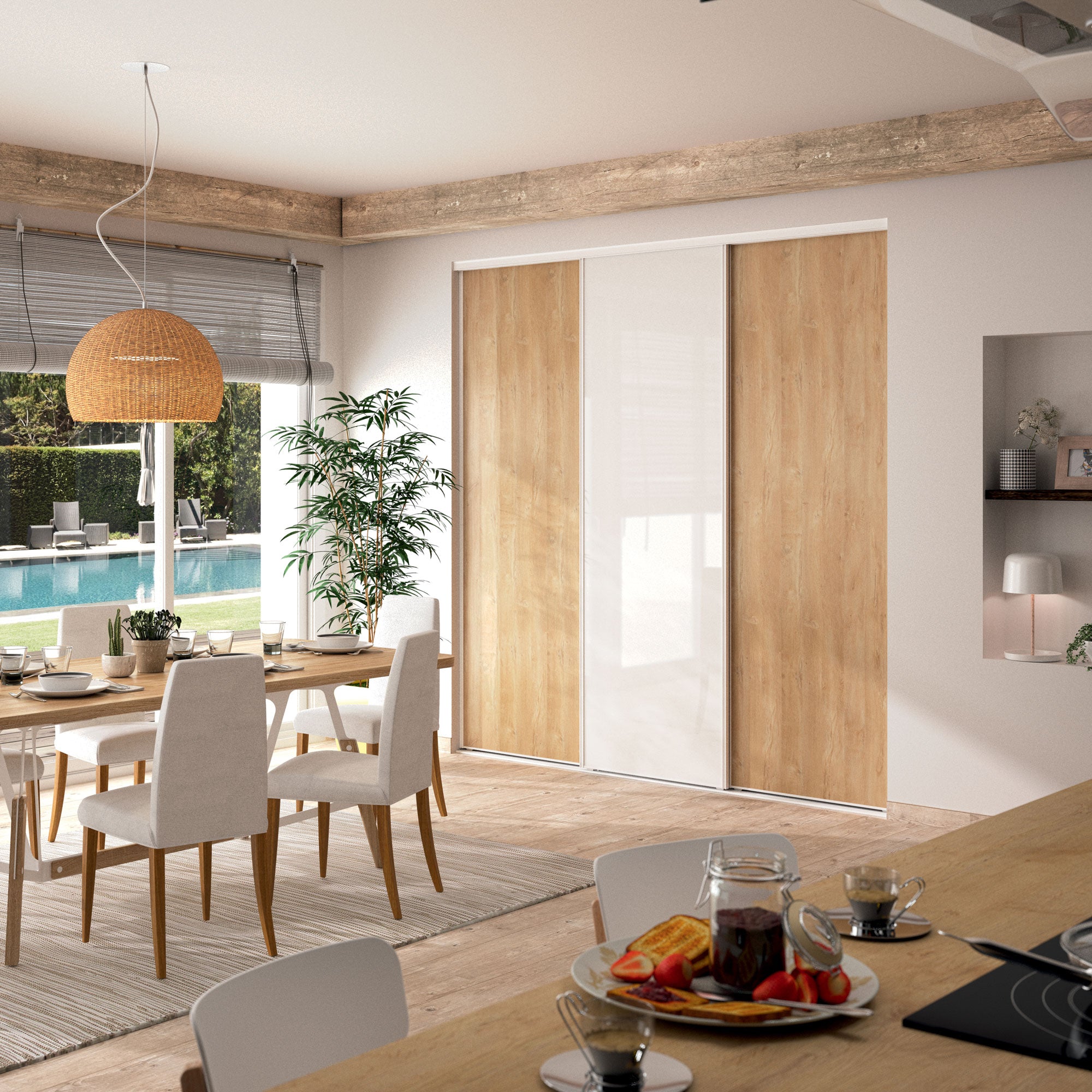 Le contraste de l'effet chêne blond et du verre laqué blanc pur de cette façade de placard apportera une touche zen et moderne à votre salon. Sublimée par sa structure en acier laqué blanc, elle ravira les pros de la décoration.