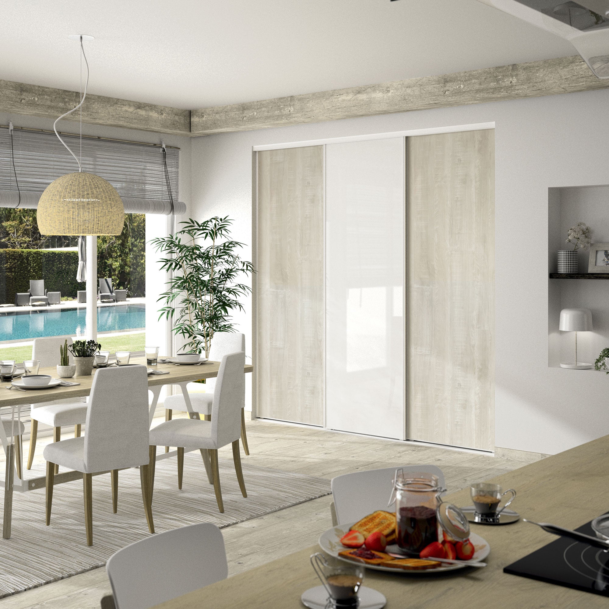 Apportez une touche estivale à votre salon avec ces portes de placard au décor bois flotté crème et en verre laqué blanc pur. L’acier laqué blanc de la structure complète l’ensemble pour un résultat éblouissant !