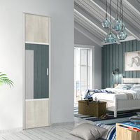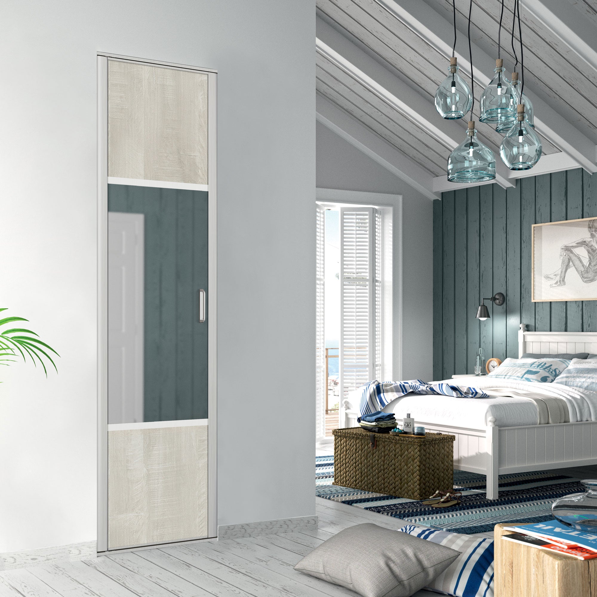 Parfaite pour une salle de bain ou une chambre, la couleur de cette façade de placard pivotante rappelle le sable de notre plage préférée ! Son miroir argent et sa structure en acier laqué gris subliment cette porte effet bois flotté crème.