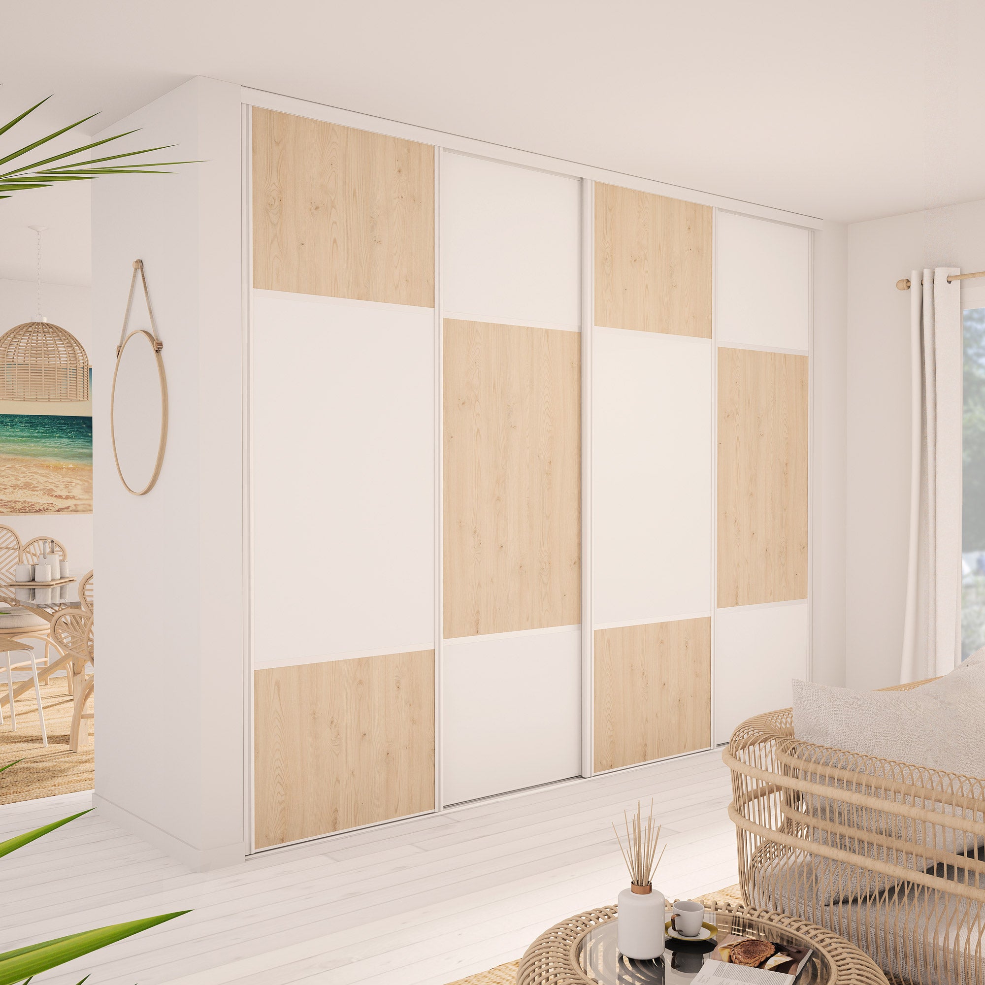 Cette façade de 4 portes de placard coulissantes, idéale pour les espaces de rangement supérieurs à 4 mètres de large, sera sublime dans votre intérieur. La composition originale en damier, son Blanc élégant et ses décors effet Châtaignier clair chaleureux seront du plus grand Goût pour magnifier votre déco. La finition est en Aluminium blanc mat.