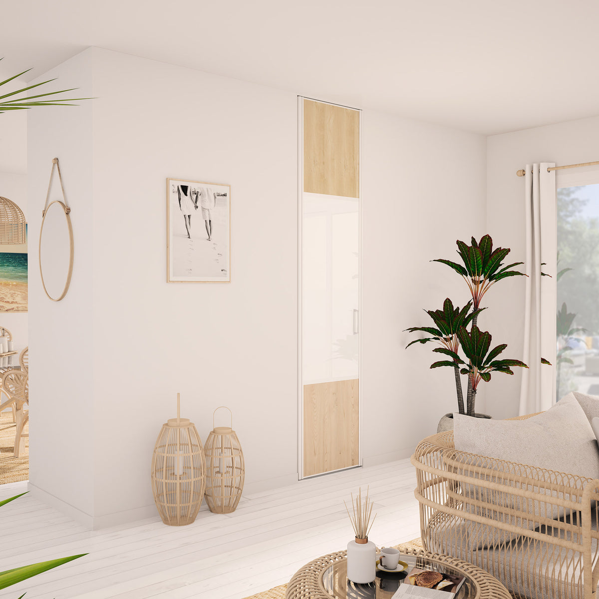 Voilà une porte de placard pour laquelle on succombe très facilement ! Elle est à la fois authentique grâce à son décor clair effet Chêne blond et moderne grâce au Blanc présent aussi sur les finitions en Aluminium. Elle présente l’immense avantage de se marier à tous les styles de déco.