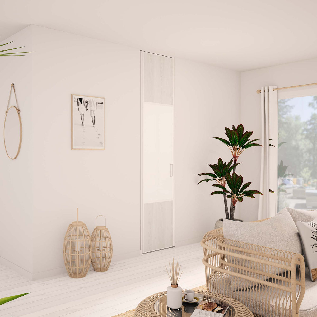 Le Blanc mat de cette porte de placard pivotante est associé à un décor Pin blanc vieilli. Cette composition graphique est complétée par une finition en Aluminium Blanc mat.