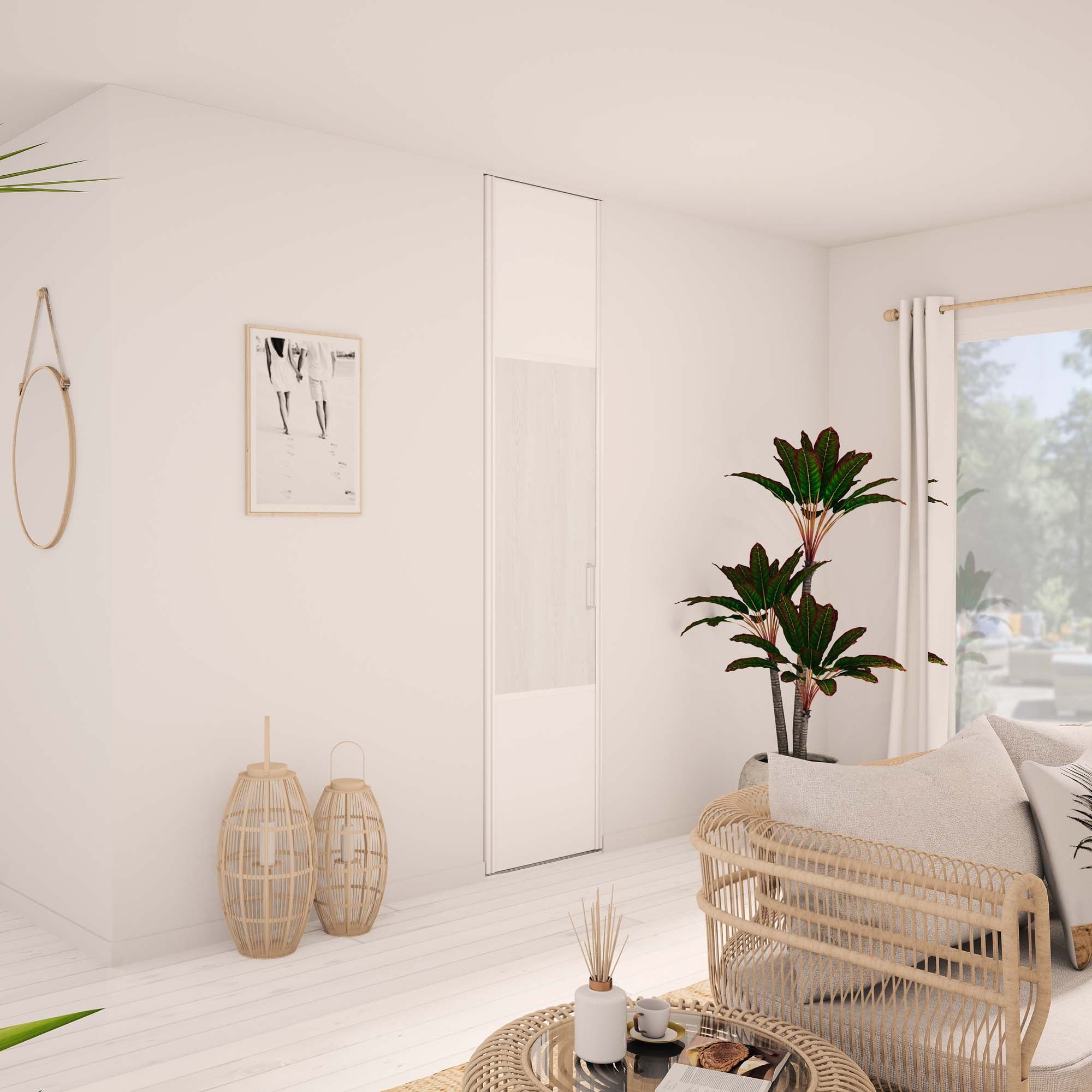 Le Blanc mat de cette porte de placard pivotante est associé à un décor Pin blanc vieilli. Cette composition graphique est complétée par une finition en Aluminium Blanc mat.
