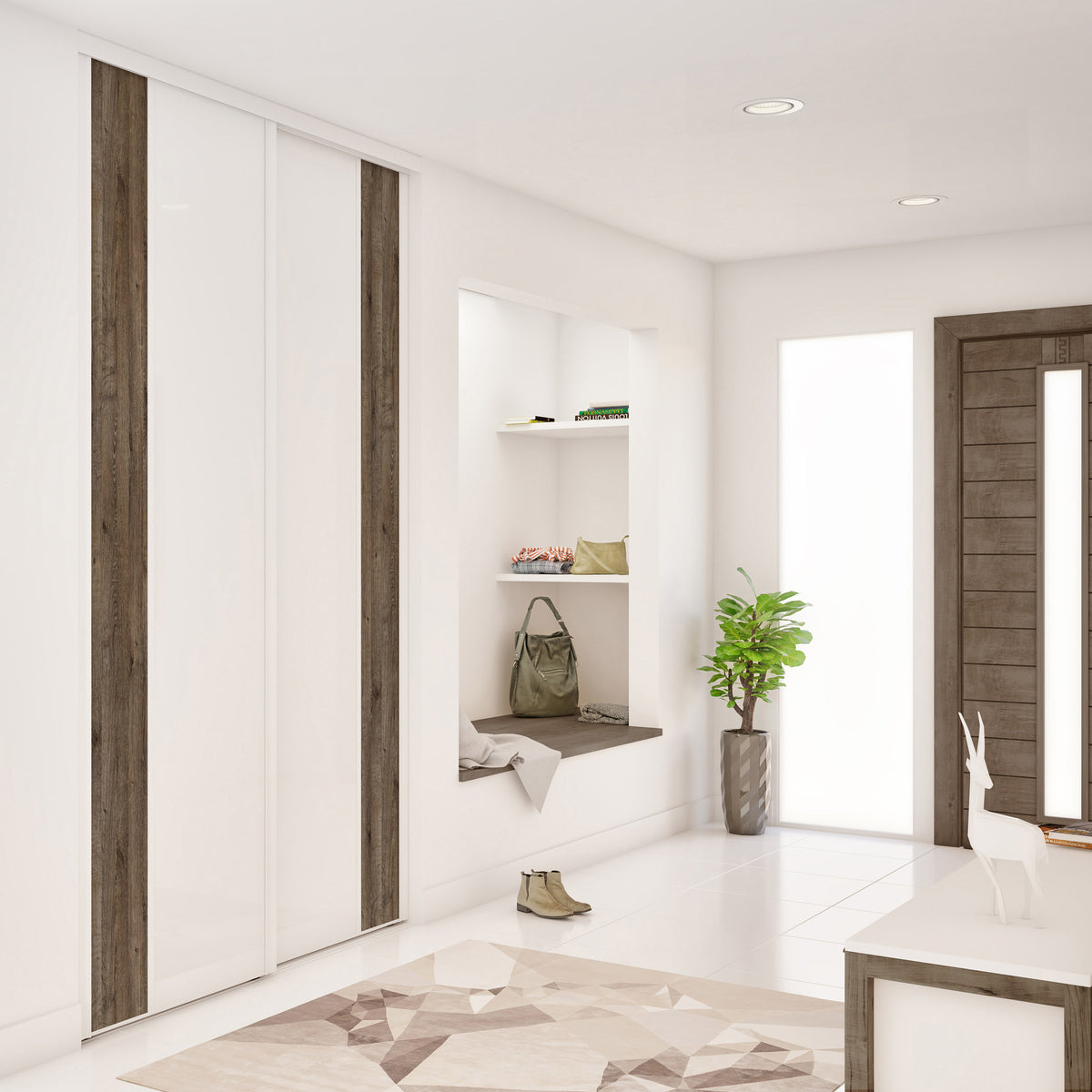 Sur cette façade de 2 portes de placard coulissantes, de chaleureuses bandes verticales à l’effet bois Authentique brun encadrent de brillants verres laqués Blanc pur. L’ensemble est valorisé par des finitions haut de gamme en aluminium Blanc mat.