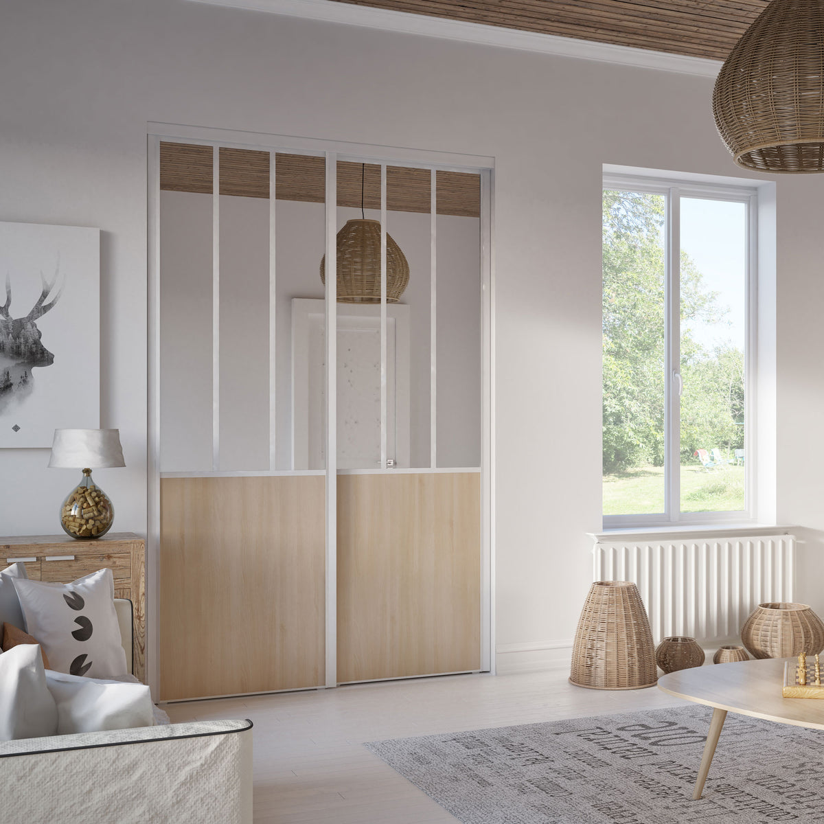 Apportez une touche d'originalité à votre intérieur avec cette porte de placard. Ce subtil mélange d'un miroir argent et d'un décor acacia clair est agrémenté de traverses et profils en aluminium blanc mat. Le rendu final est moderne et chaleureux.