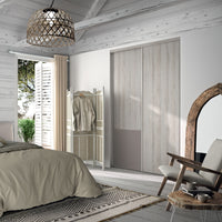Alliez modernité et authenticité grâce à cette collection de portes de placard coulissantes mélangeant les matières. Le décor frêne tabac de ces portes est similaire à la structure en aluminium. Une touche de moka se démarque pour un esprit cocooning et lumineux.