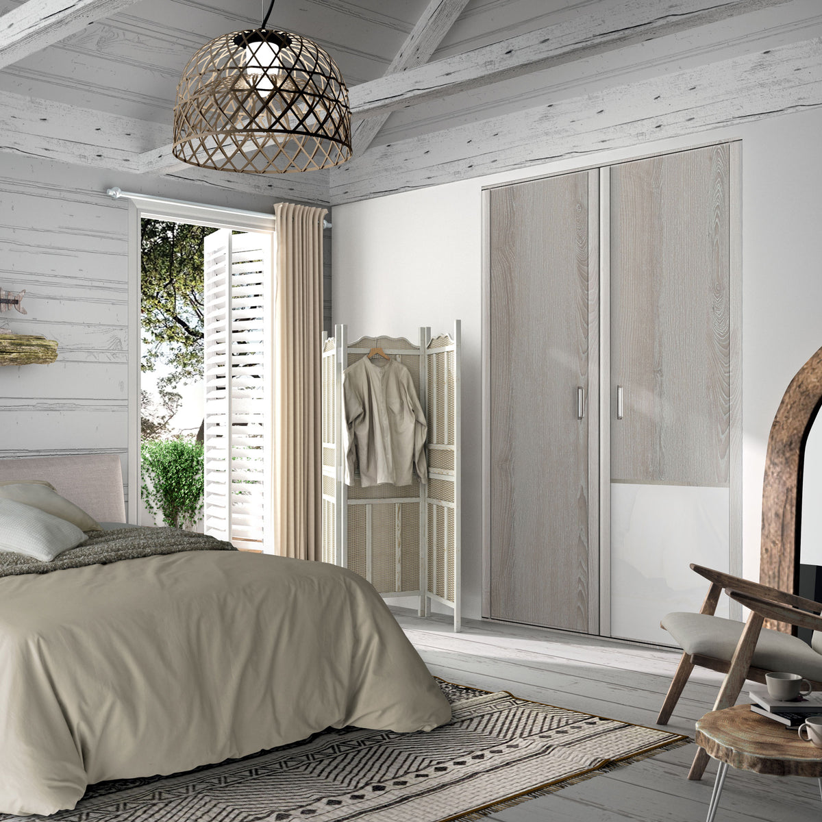 Alliez modernité et authenticité grâce à cette collection de portes de placard pivotantes mélangeant les matières. Le décor frêne tabac de ces portes est similaire à la structure en aluminium. Une touche de verre laqué blanc pur se démarque pour un esprit cocooning et lumineux.