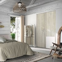 Alliez modernité et authenticité grâce à cette collection de portes de placard pivotantes mélangeant les matières. Le décor bois flotté crême de ces portes est similaire à la structure en aluminium. Une touche de blanc mat se démarque pour un esprit cocooning et lumineux.