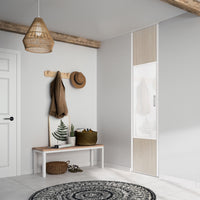 Retrouvez le naturel du bois et la pureté du blanc sur une porte aux motifs en ligne, dans un style qui apportera sérénité et élégance à votre intérieur. La structure en acier laqué blanc se confond parfaitement au décor bois patiné rose et au verre laqué blanc pur.