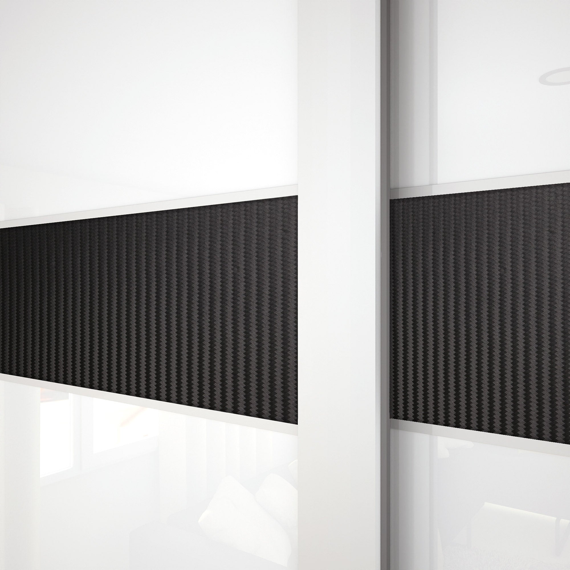La frise haute, très chic, effet cuir Carbone est mise en valeur par de lumineux et intemporels verres laqués Blanc pur. Les traverses fines et la finition en aluminium Blanc mat subliment cette composition ultra moderne.