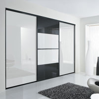 Apportez de la luminosité et du caractère à votre pièce avec ces trois portes coulissantes en verre laqué blanc pur, réhaussé de verre laqué noir. Le style très graphique de cette façade de placard est renforcé par une finition soignée en aluminium noir mat.
