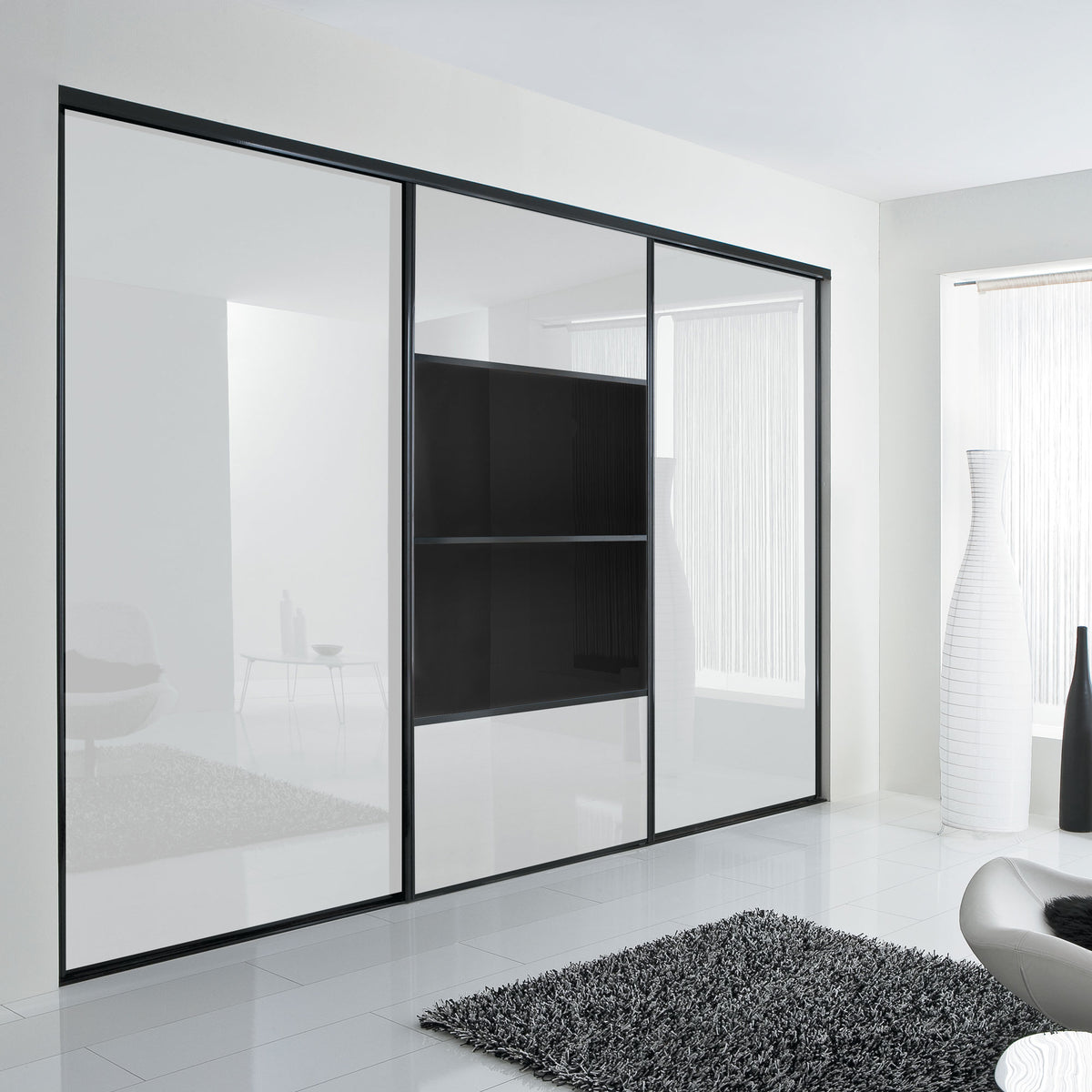 Apportez de la luminosité et du caractère à votre pièce avec ces trois portes coulissantes en verre laqué blanc pur, réhaussé de verre laqué noir. Le style très graphique de cette façade de placard est renforcé par une finition soignée en aluminium noir mat.