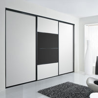 Cette façade de placard coulissante à dominante blanc mat est sublimée par une touche de noir intense. Le style très graphique de cette façade de placard est renforcé par une finition soignée en aluminium noir mat.