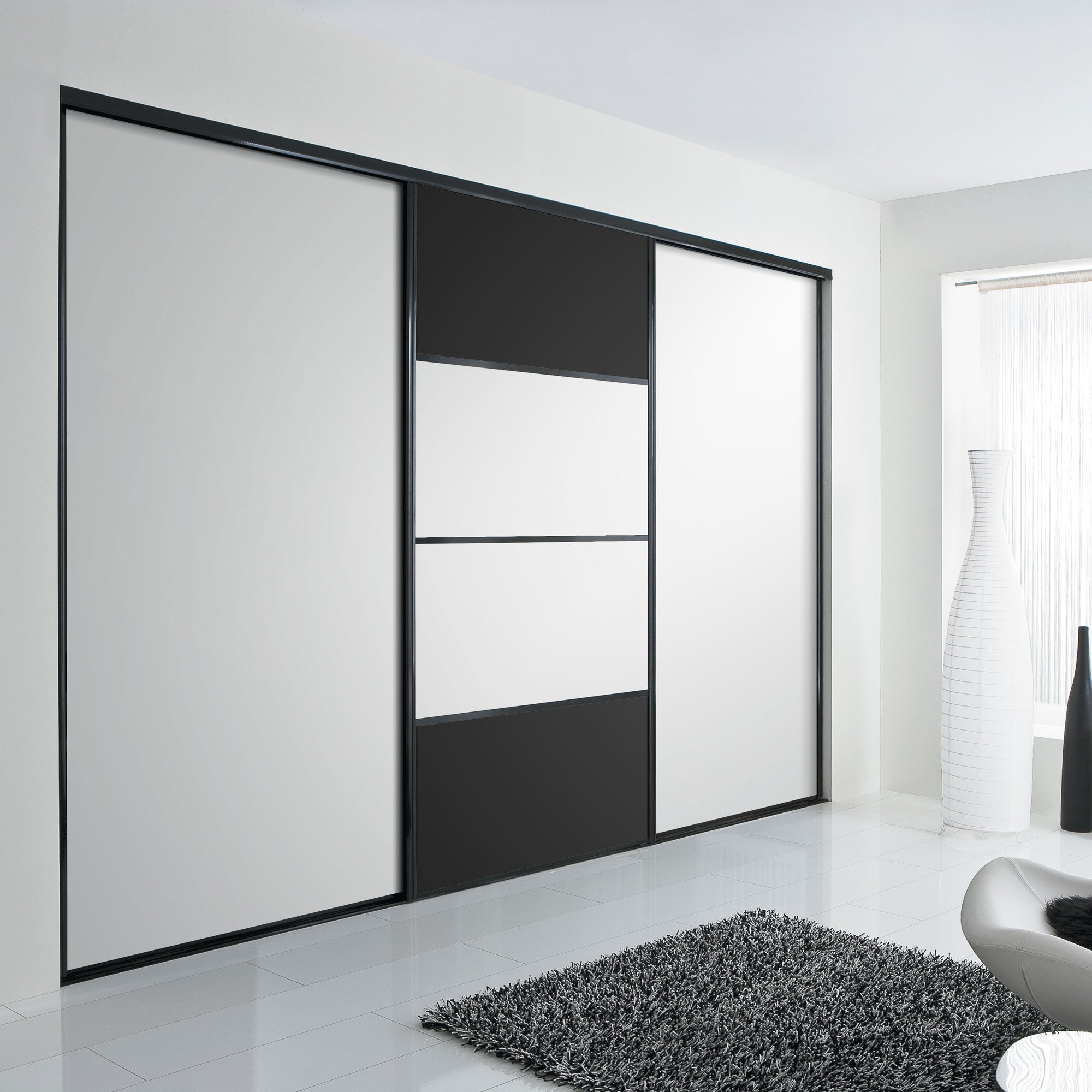Cette façade de placard coulissante à dominante blanc mat est sublimée par une touche de noir intense. Le style très graphique de cette façade de placard est renforcé par une finition soignée en aluminium noir mat.