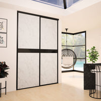 On adore ces deux portes de placard coulissantes ! Elles allient un majestueux effet Marbre blanc et une lumineuse frise centrale en verre laqué Noir. Le rendu est parfait ! Les finitions en aluminium Noir mat et les traverses fines apportent LA touche d’élégance inégalable qu’il vous faut.