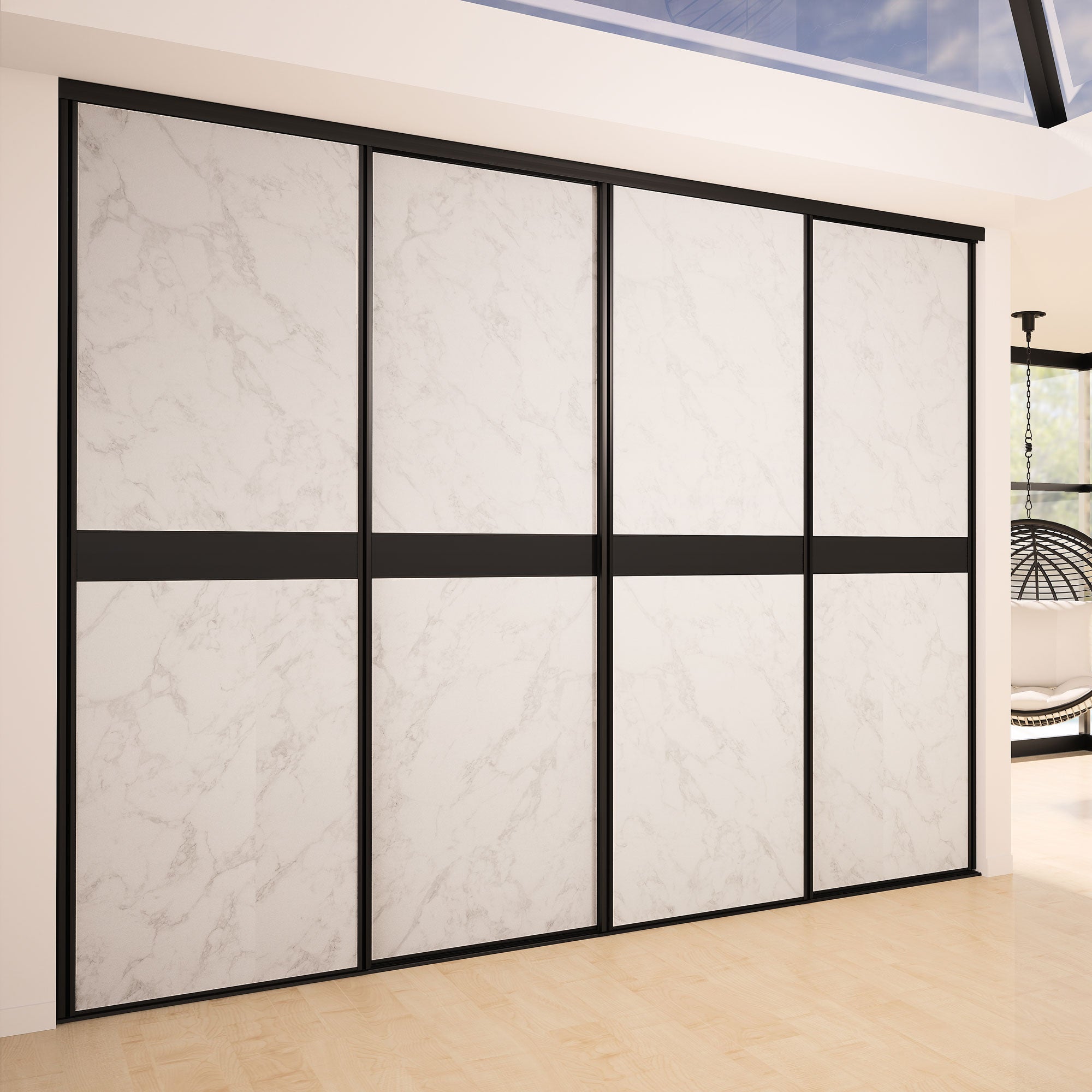Pour ces quatre portes coulissantes, le décor Noir intense de la frise centrale s’associe à une majestueux décor Marbre blanc. Ce contraste de couleur est sublimé par des traverses fines et des finitions en aluminium Noir mat. L’association intemporelle du noir et du blanc représente l’immense avantage de sublimer toutes les décos !
