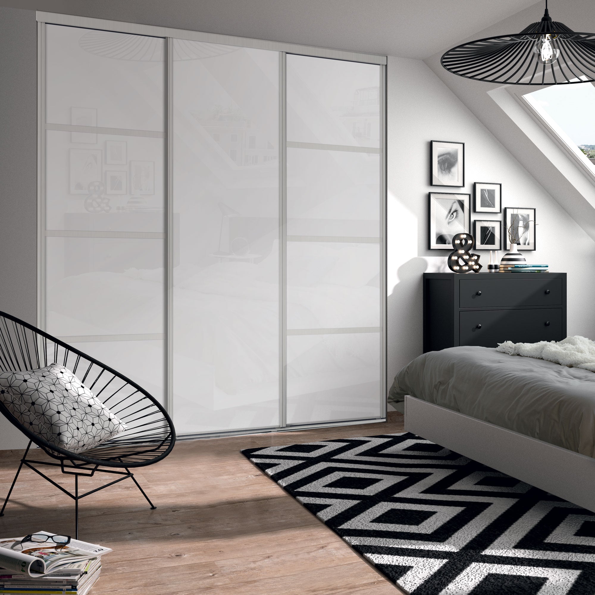 Vous aimerez la luminosité et la pureté de ces 3 portes de placard coulissantes en verre laqué blanc pur. Les traverses des deux portes extérieures et les finitions en aluminium naturel apportent un design graphique à un produit haut de gamme.