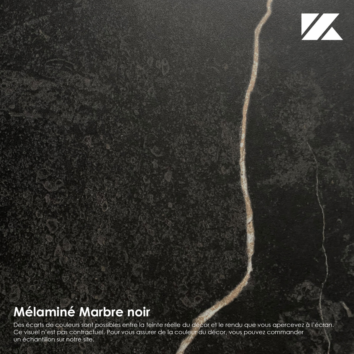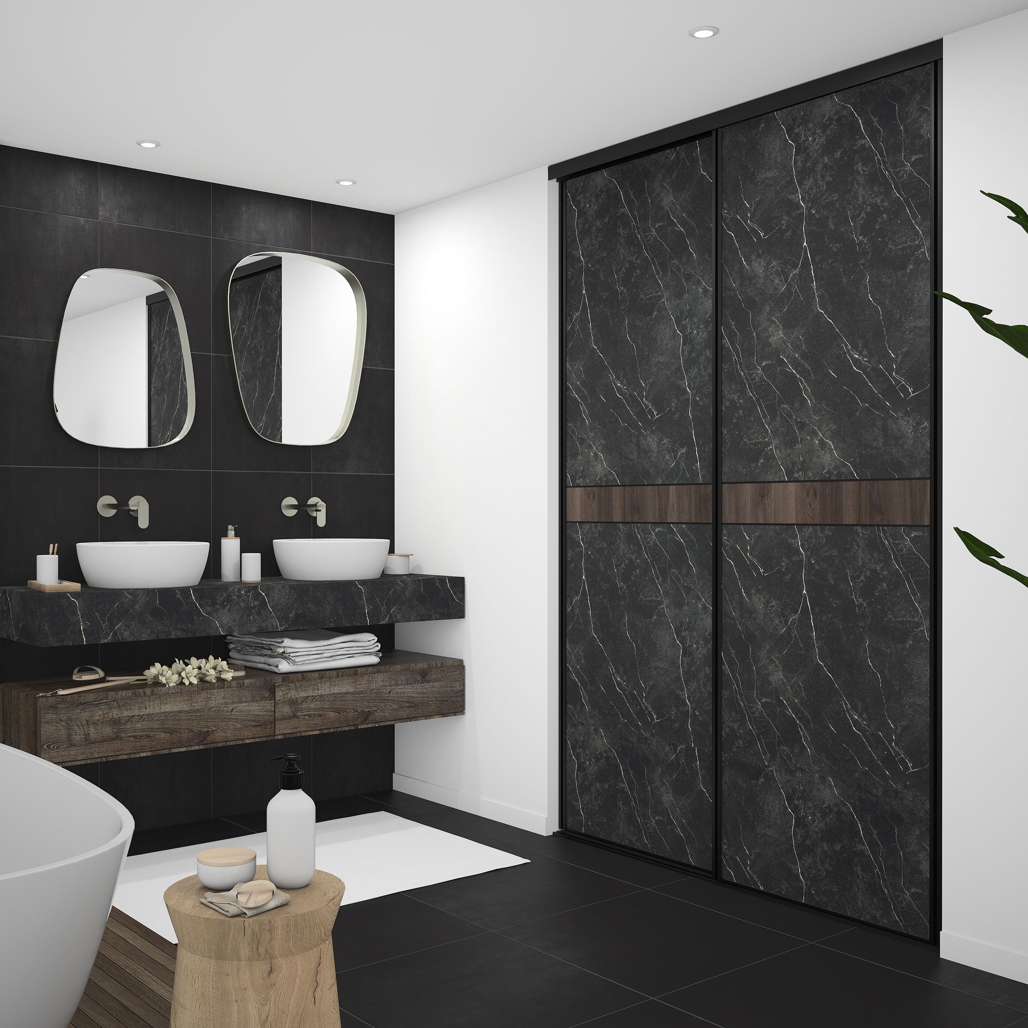 Le majestueux effet Marbre noir de ces portes de placard coulissantes est sublimé par une chaleureuse frise centrale au décor Noyer des Andes. Les finitions et les traverses fines en aluminium noir mat soulignent l’élégance de l’ensemble.