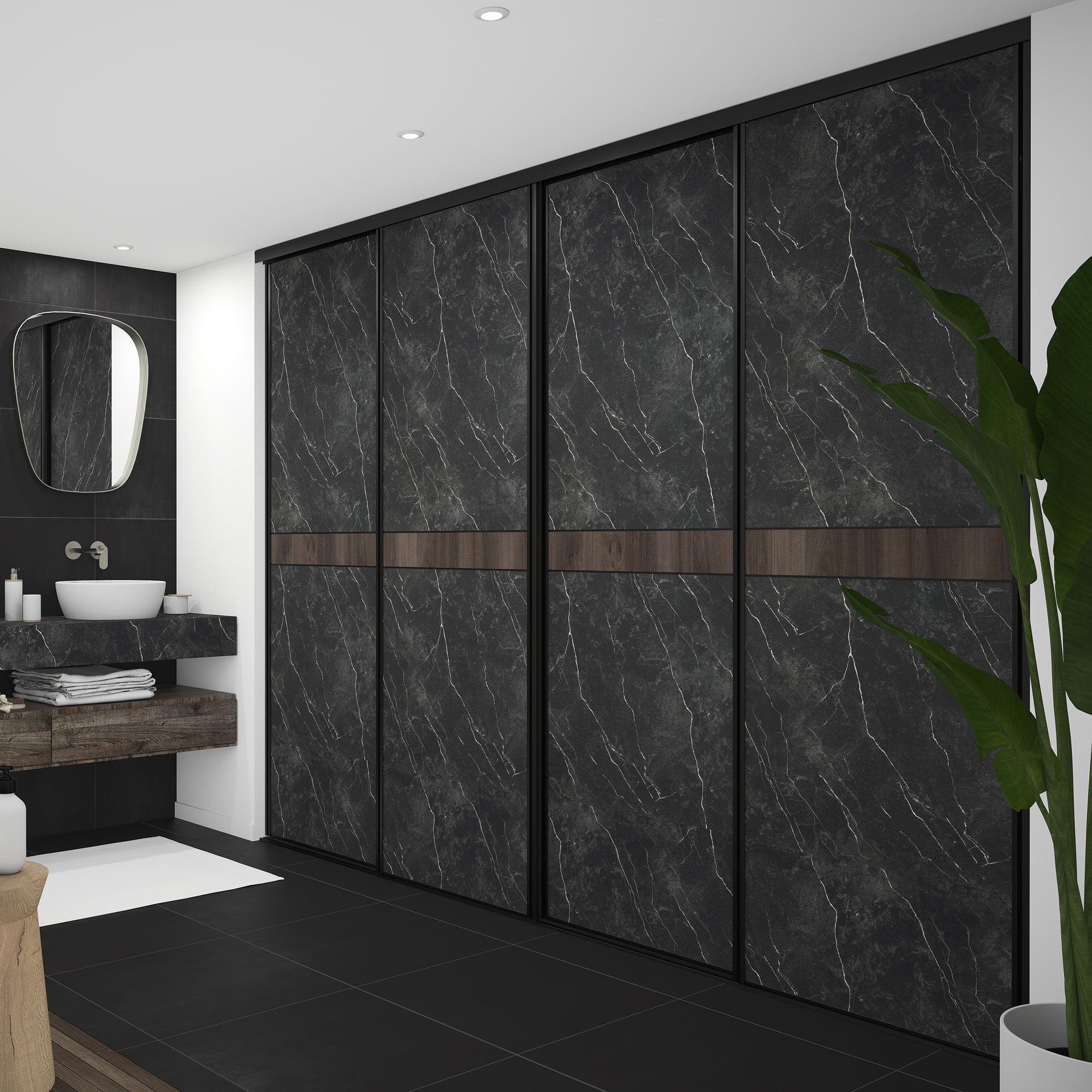 Le majestueux effet Marbre noir de ces portes de placard coulissantes est sublimé par une chaleureuse frise centrale au décor Noyer des Andes. Les finitions et les traverses fines en aluminium noir mat soulignent l’élégance de l’ensemble.