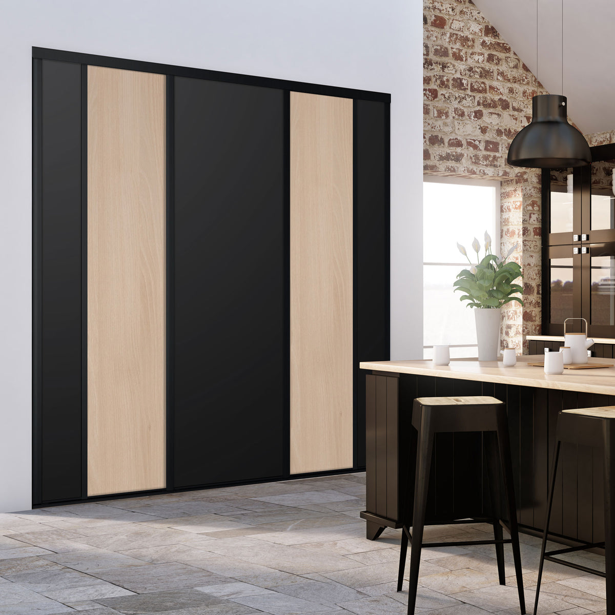 Cette collection élégante et tendance associe l'authenticité d'un effet acacia clair à la profondeur d'un noir intense. Les profils en aluminium assorties donnent un ton chic et boisé à ces portes de placard coulissantes.