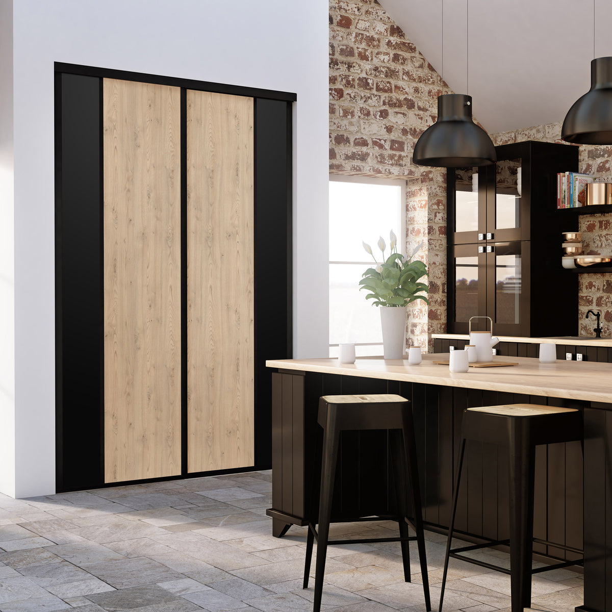 Cette belle façade de placard de deux portes coulissantes sur une solide structure en aluminium assortie est faite pour vous ! Elle associe avec élégance un décor Noir intense pour la modernité et un effet Châtaignier clair pour la chaleur. Elle s’intègrera facilement à votre intérieur.