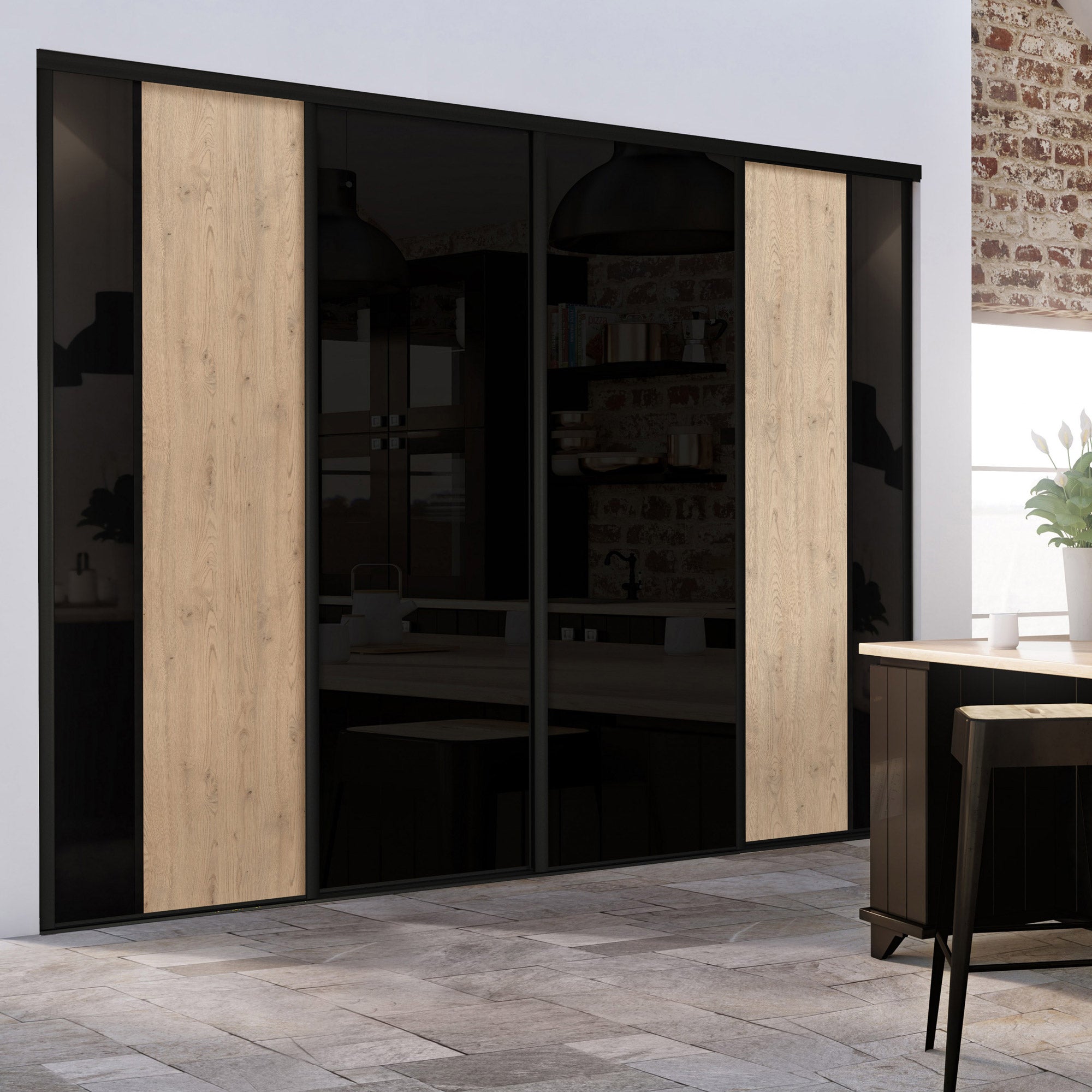 Vous allez adorer ces portes Kazed au style moderne et chaleureux. Elles donneront du caractère à votre déco. Le Châtaignier clair et le verre laqué Noir s’accordent parfaitement. Ils sont sublimés par des finitions de qualité en aluminium Noir mat.